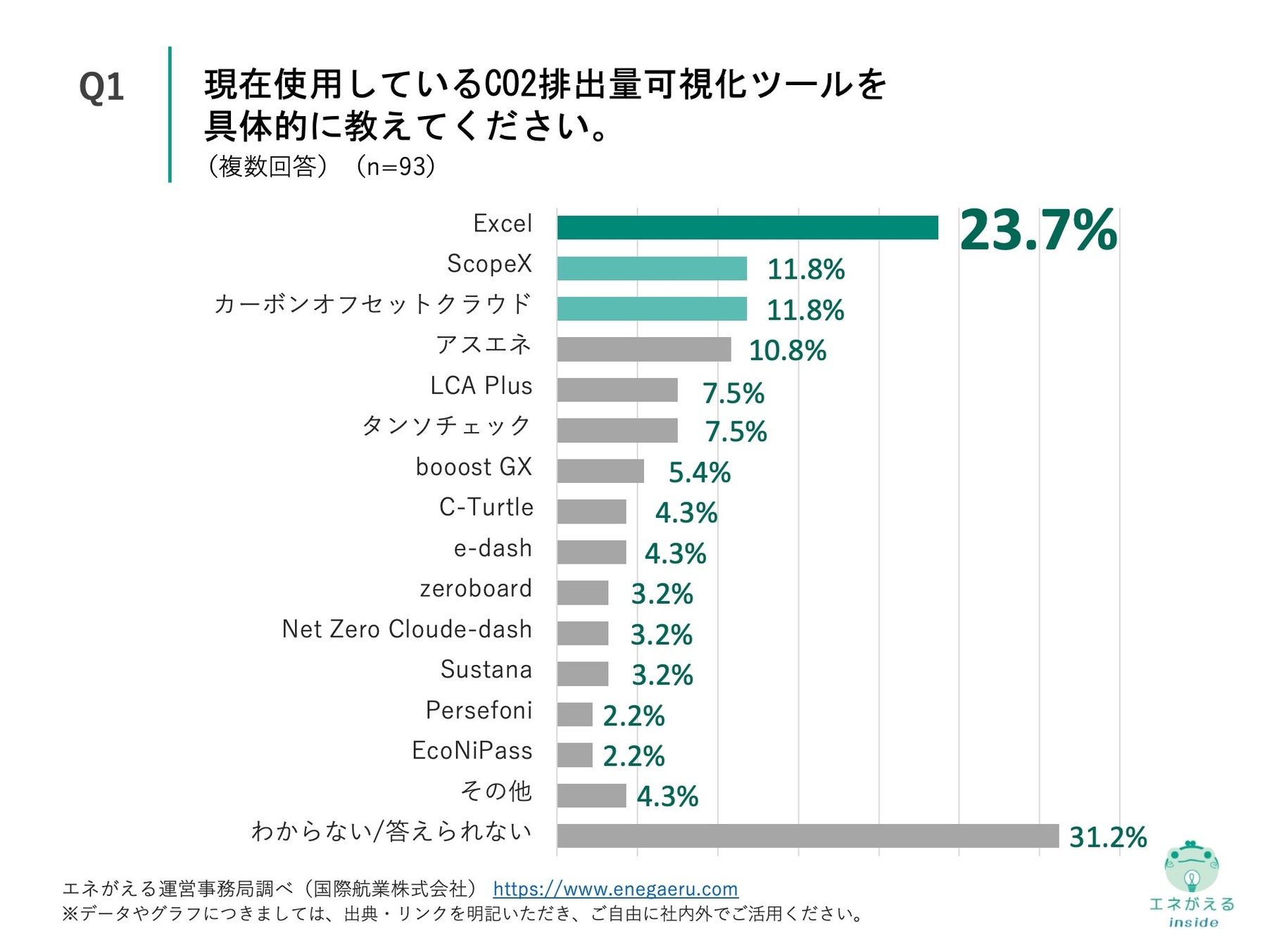 「Q1.現在使用しているCO2排出量可視化ツールを具体的に教えてください。(複数回答)」(n=93)と質問したところ、「Excel」が23.7%、「ScopeX」が11.8%、「カーボンオフセットクラウド」が11.8%という回答になりました。