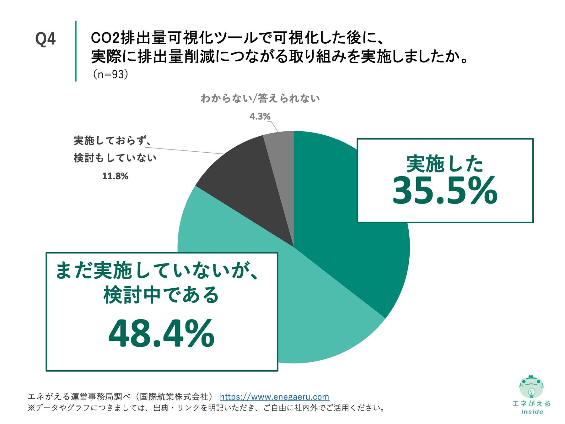 「Q4.CO2排出量可視化ツールで可視化した後に、実際に排出量削減につながる取り組みを実施しましたか。」(n=93)と質問したところ、「実施した」が35.5%、「まだ実施していないが、検討中である」が48.4%という回答になりました。