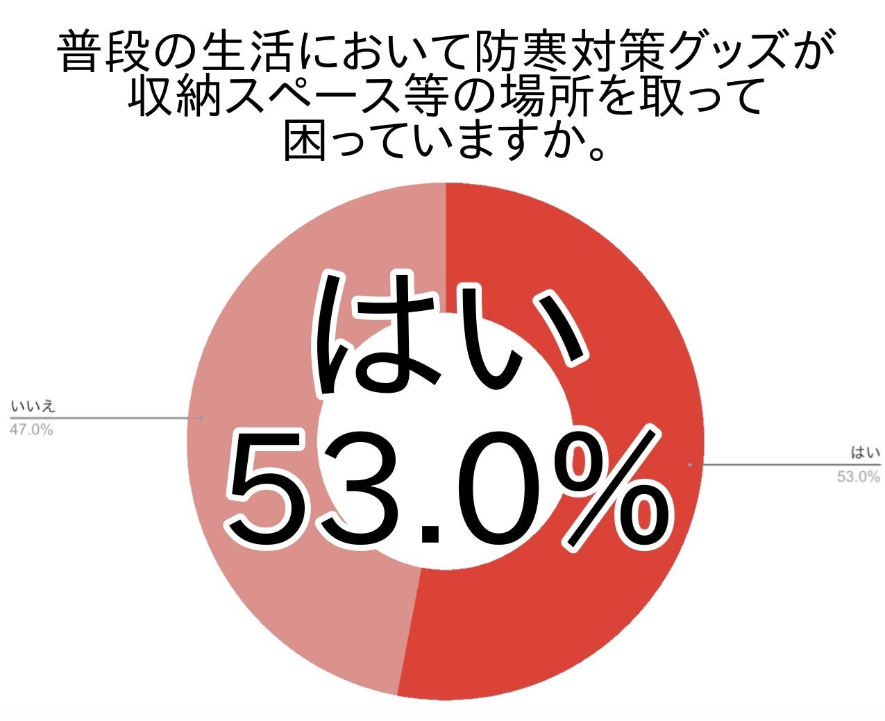 そこでアンケートでは次に、防寒対策グッズを使っていない時やシーズンオフ等、普段の生活において防寒対策グッズや家電が収納スペース等で場所を取って困っているかを尋ねました。