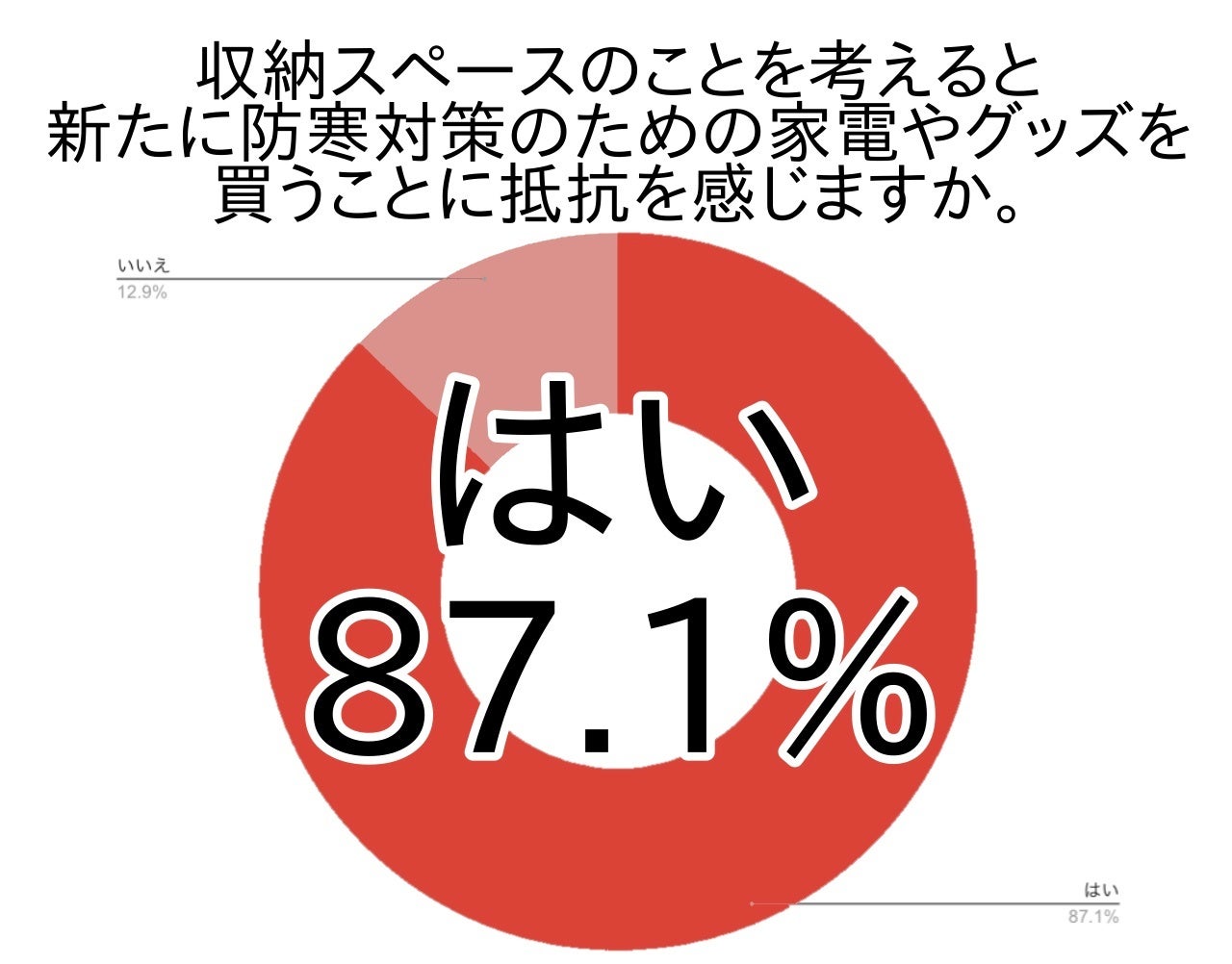 収納スペースのことを考えると新たに防寒対策のための家電やグッズを買うことに抵抗を感じると答えた方は9割弱(関東87.1%・全国86.7%)にものぼることが分かりました。