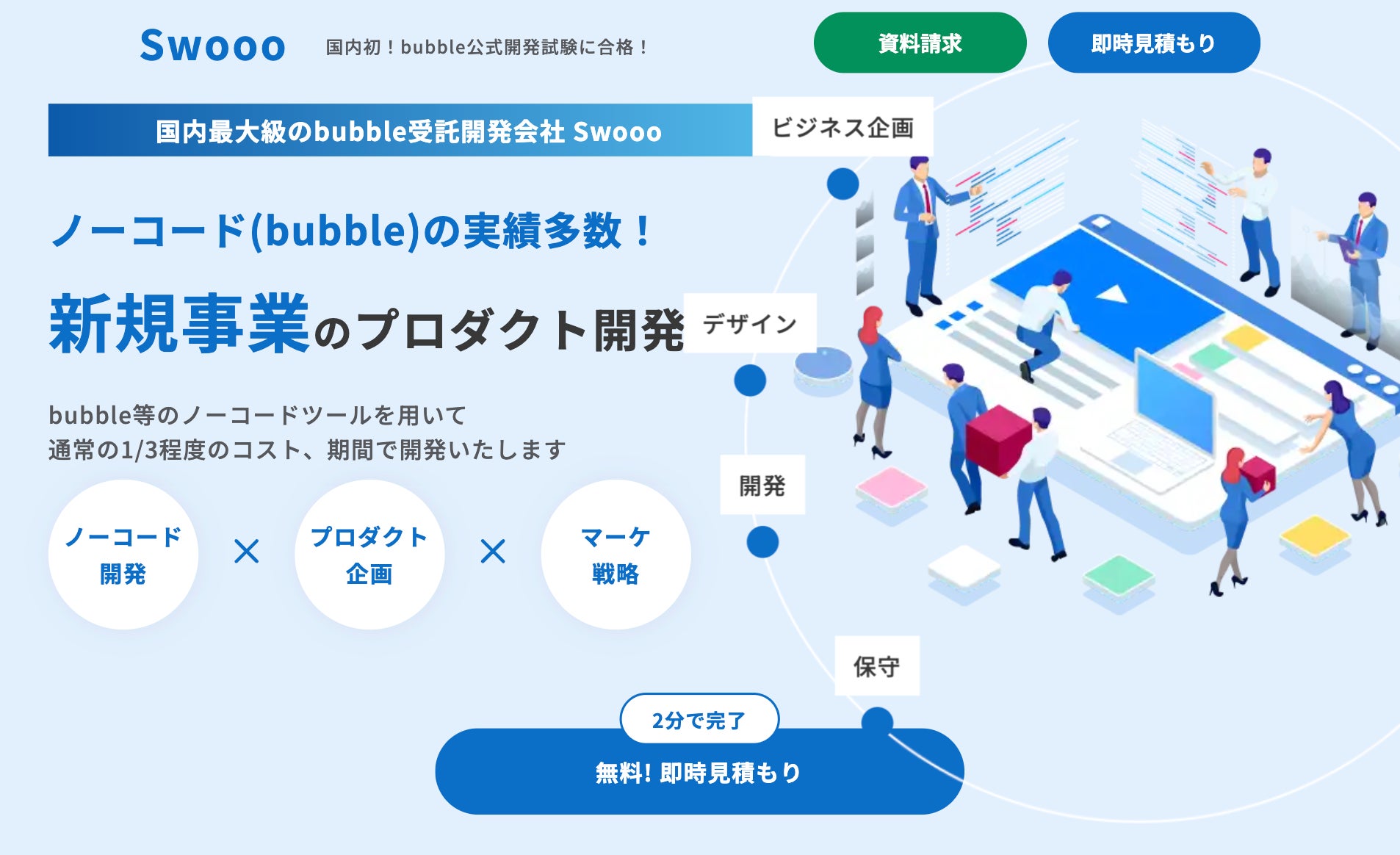 ノーコード受託開発「Swooo」は、「コーディング不要のノーコードツールbubbleを活用し、従来よりもコストを抑え、そして早く実現させる」webシステム開発サービスです。