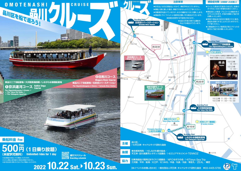 回遊を促進するため、乗船料は1日乗り放題で500円。なお、クルーズを実施する2日間は、10月10日にオープンした文化・スポーツ活動の拠点「アイルしながわ」で、道遊び・飲食コーナーや雅楽「打球楽」が楽しめるほか、大井競馬場では「東京メガイルミ」が開催されています。