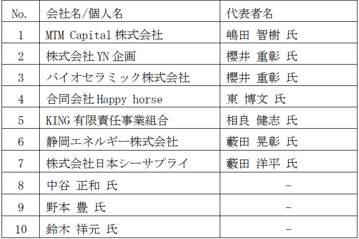 本勧告書において、当社独立委員会は、MTM Capital株式会社、株式会社YN企画、バイオセラミック株式会社、合同会社Happy horse、KING有限責任事業組合、静岡エネルギー株式会社、株式会社日本シーサプライ、中谷正和氏、野本豊氏及び鈴木祥元氏(以下「本認定対象株主」といいます。)の間において、当社株式に関して共同協調行為に該当する行為を行っていると認められる旨勧告しております。