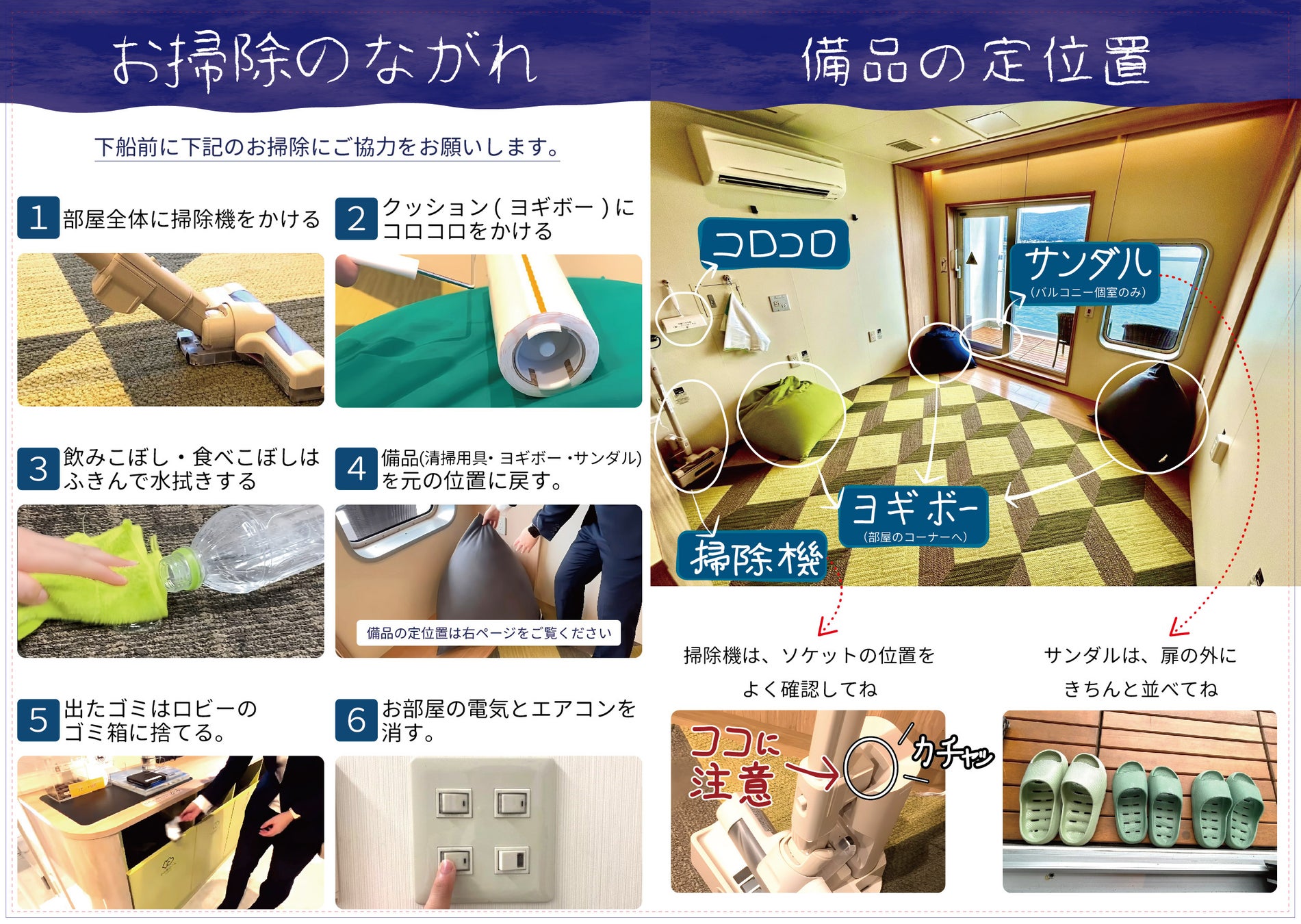 ご退室前に、下記の「お掃除のながれ」にしたがって掃除する。掃除が終わったら「お掃除チェックリスト」に✓をいれて所定の場所に置く。