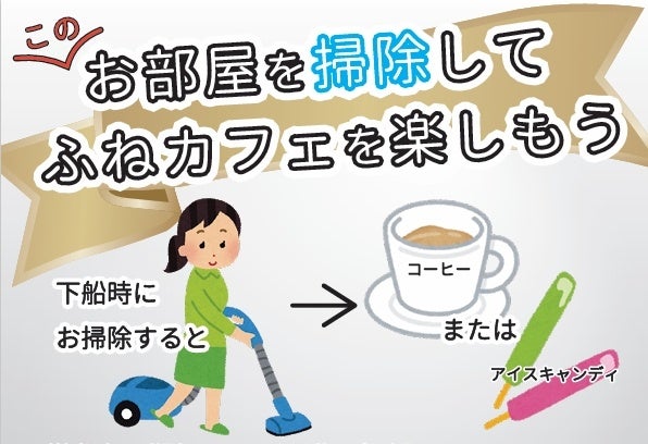使用したお部屋の掃除に、下船前にご協力下さった方に、特典として、本格的なカフェの味わいが楽しめる「ふねカフェ」1杯、またはDoleアイスキャンディ1本をプレゼント!
