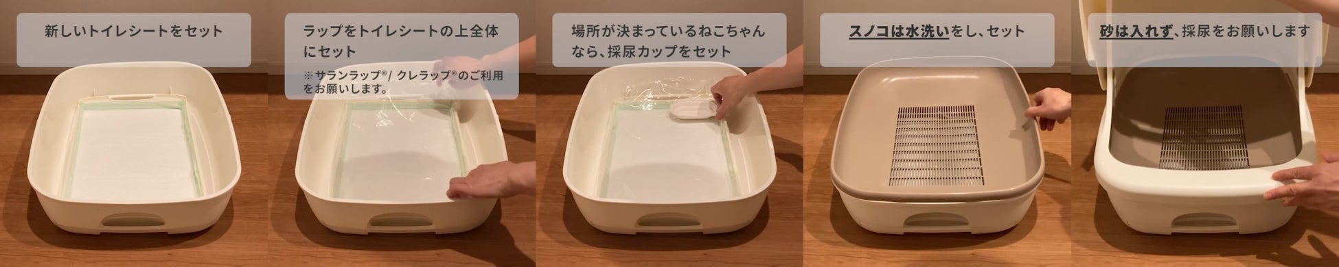 ご利用のお客さまより喜びのお声をいただくと同時に、採尿方法のご提案を受け、より簡単に受検いただけるよう、新しい採尿方法を検討いたしました。お客さまからのご意見をもとに研究を重ねた結果、従来の直接採尿する方法に加え、システムトイレを使った採尿方法が加わりました。この新採尿方法導入により、飼い主の皆さまにはより取り扱いやすく、愛猫にとってはよりストレスの少ない方法を選択いただくことが可能になりました。