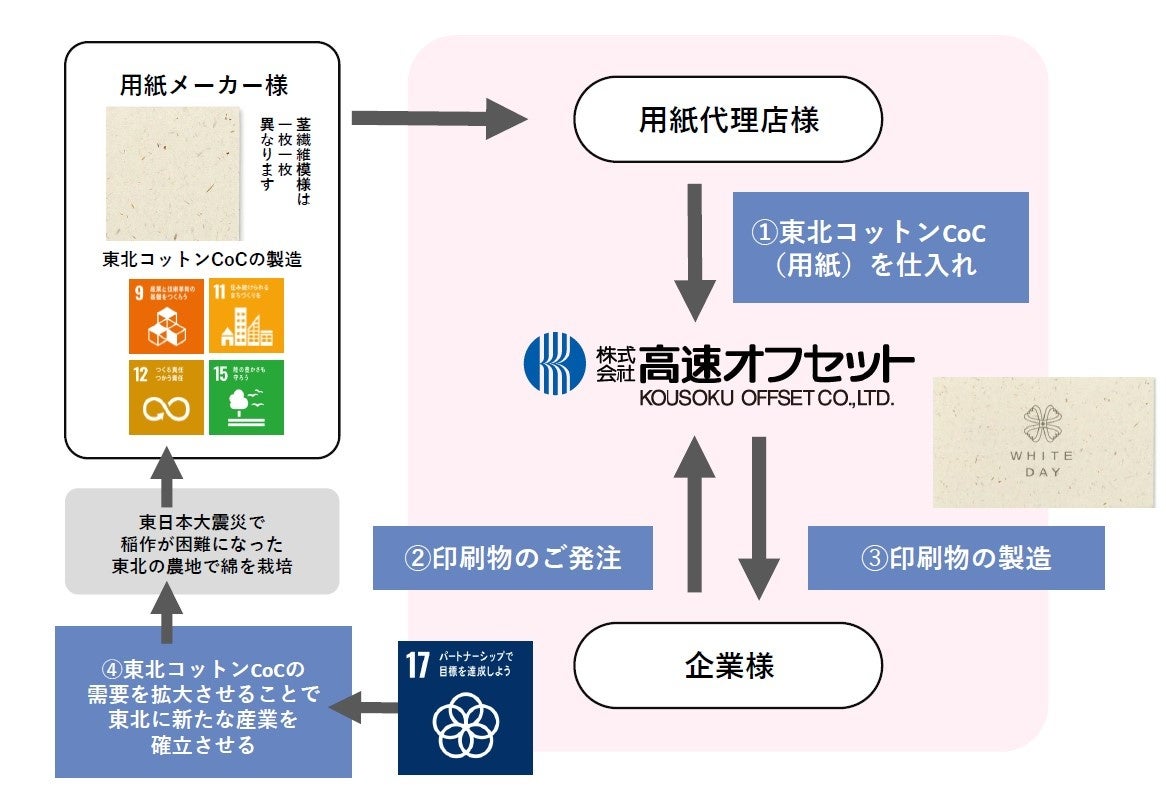 東北の地で作られた綿の茎繊維は、森林認証パルプと混ぜ合わされて紙になります。SDGsの目標である「9.産業と技術革新の基盤をつくろう」「11. 住み続けられるまちづくりを」「12. つくる責任 つかう責任」「15. 陸の豊かさも守ろう」に貢献できる用紙です。その用紙を用紙代理店様が仕入れ、当社が購入し、企業様の印刷物のご依頼に合わせて印刷製品を作ります。企業一丸となり、東北コットンCoCの需要を拡大させることで、東北に新たな産業を確立させることを目的としています。