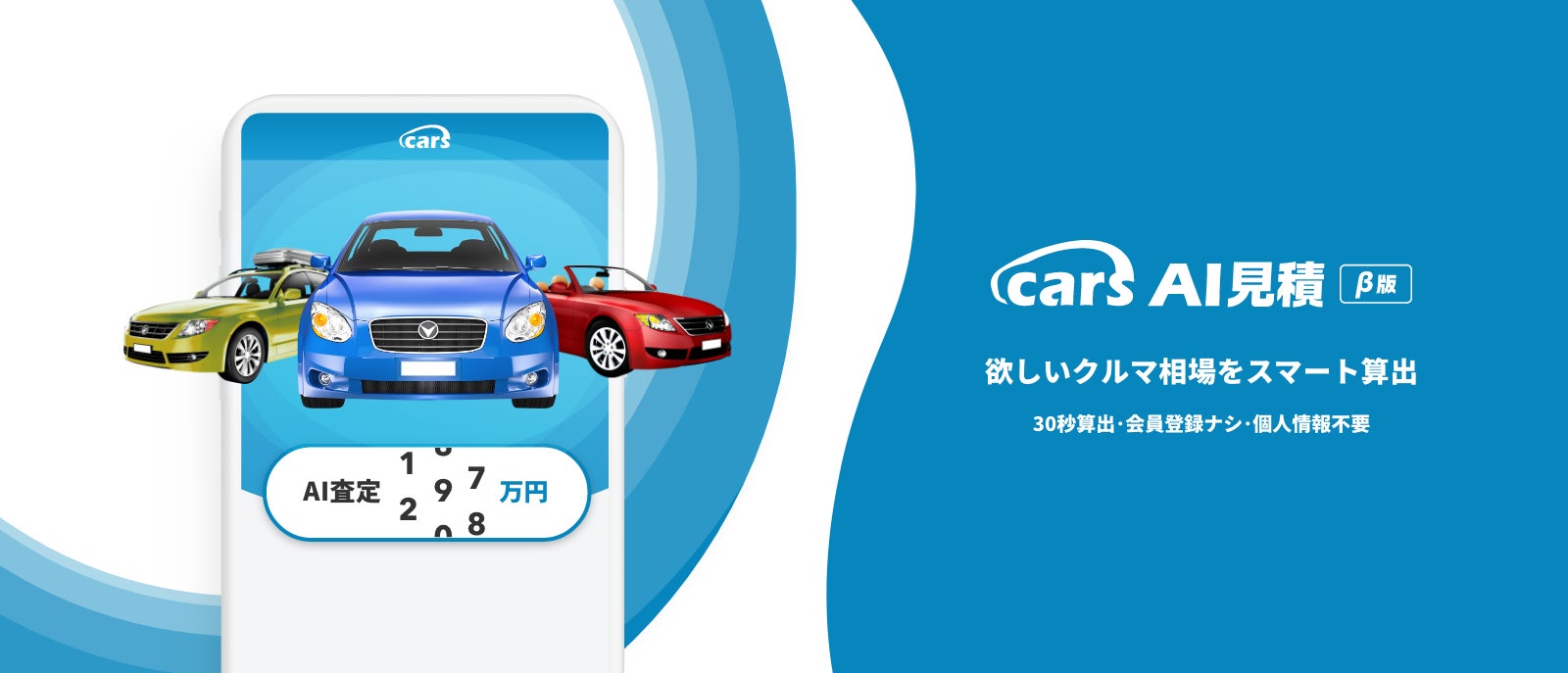 carsの「AI見積」は、中古市場の売買データから独自のアルゴリズムで対象車両の相場を瞬時に算出するサービスです。車両の相場価格は日々変動しますが、carsの「AI見積」は変動するデータを常に自動更新してAIが対象車両の価格相場を自動算出。マイカー乗換に際して、気になるクルマ参考価格を手軽に調べることができます。