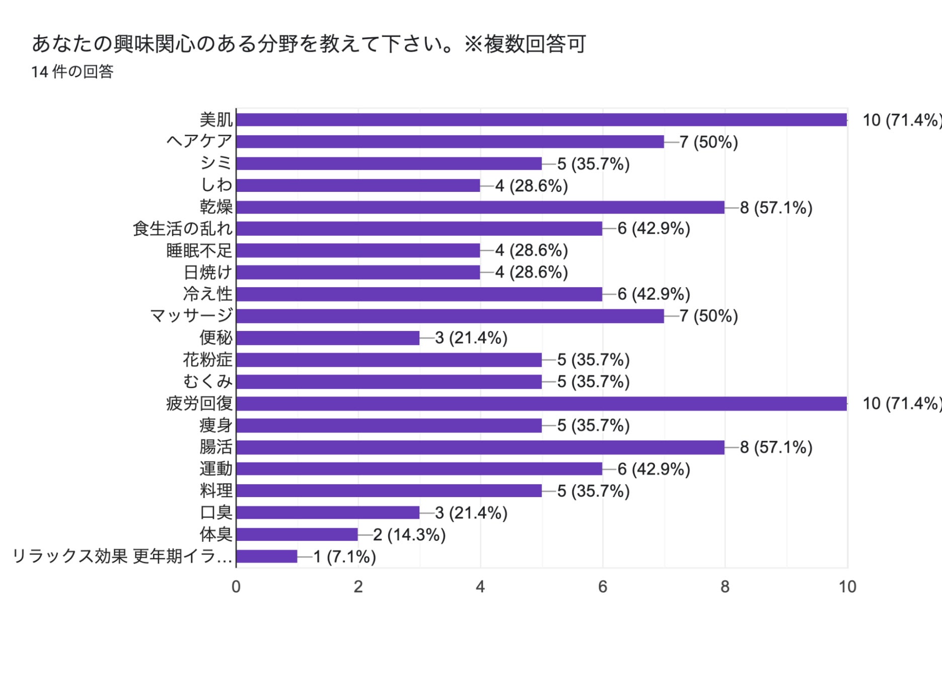 今回のワークショップで、参加者14名から興味関心のあるテーマについてアンケートを取りました(複数回答可)。その結果、「美肌」「疲労回復」「ヘアケア」への関心が特に高いことが分かりました。