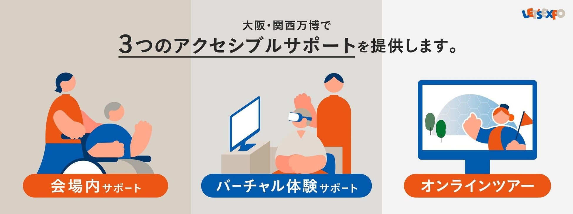 「LET’S EXPO」が提供する3つの「アクセシブルサポート」のうち、万博へのオンライン参加をサポートするサービスである 「バーチャル体験サポート」において、博覧会協会と連携し、高齢者や障がい者の方々を対象としたバーチャル万博体験の支援を全国で行ってまいります。