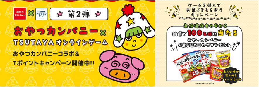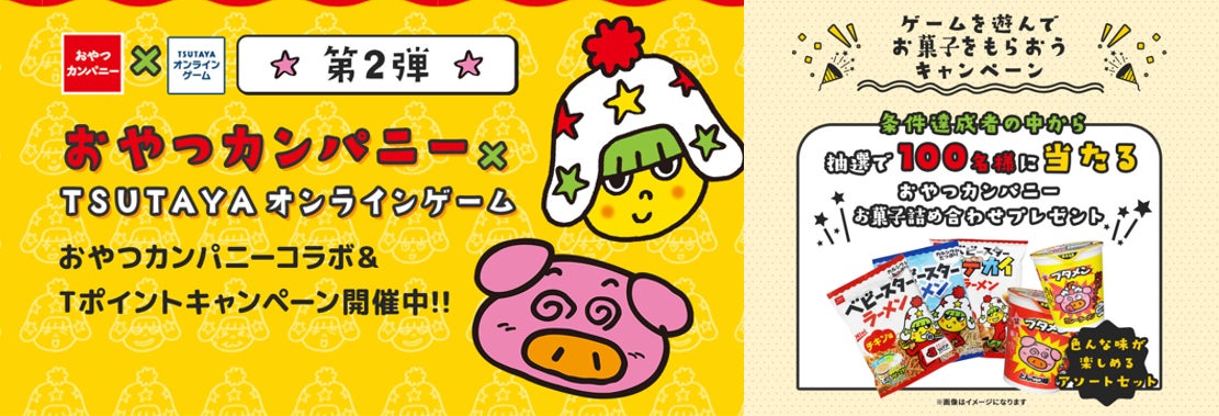 カルチュア・エンタテインメント株式会社 (本社:東京都品川区、代表取締役 社長執行役員:中西 一雄)は、菓子・食品製造販売を手がける株式会社おやつカンパニー(本社:三重県津市 代表取締役社長:手島文雄)とのコラボレーション企画として「おやつカンパニー」×「TSUTAYA オンラインゲーム」コラボイベントを6月23日(金)より開始いたしました。