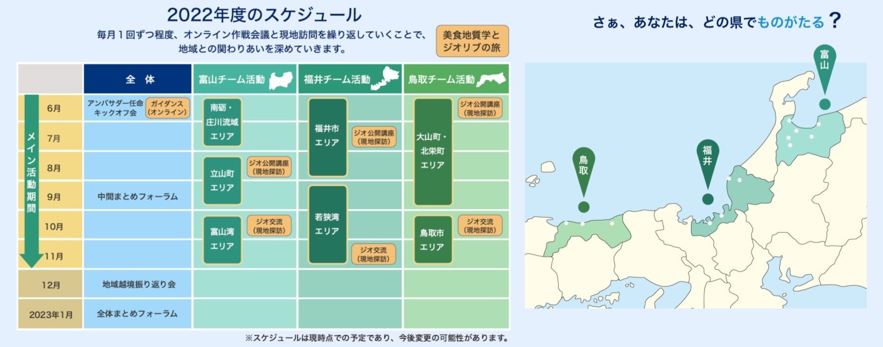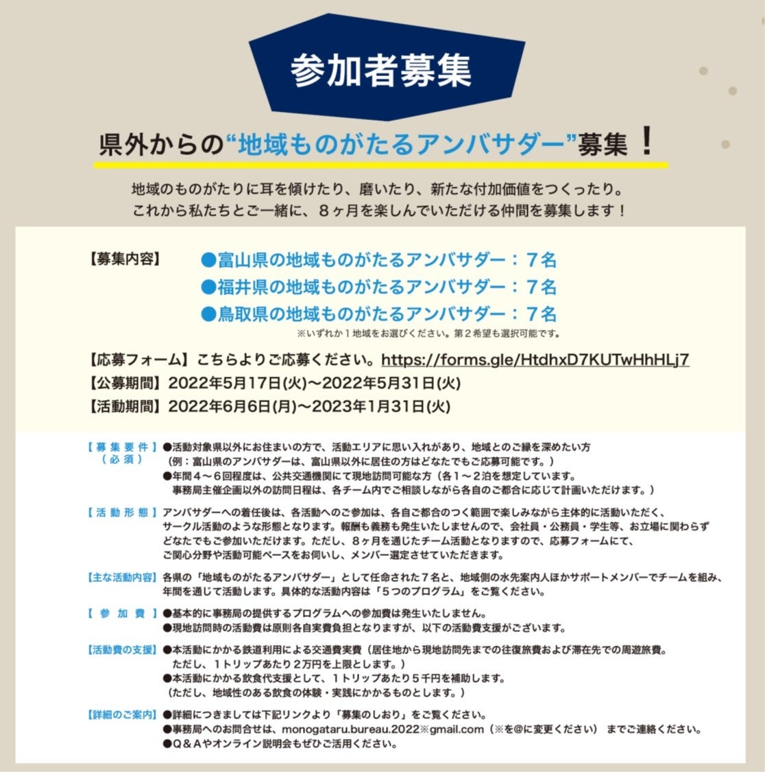 今年度は、富山県・福井県・鳥取県にて、県外から地域へ通い地域との交流を深める「地域ものがたるアンバサダー」を各県7名ずつ(計21名)募集します。個々人での活動ではなく、アンバサダーと地域の水先案内人と専門家を含む事務局でチームを組み、年間を通じて、現地訪問やオンライン交流を繰り返すことで、地域への理解や愛着を深めていきます。