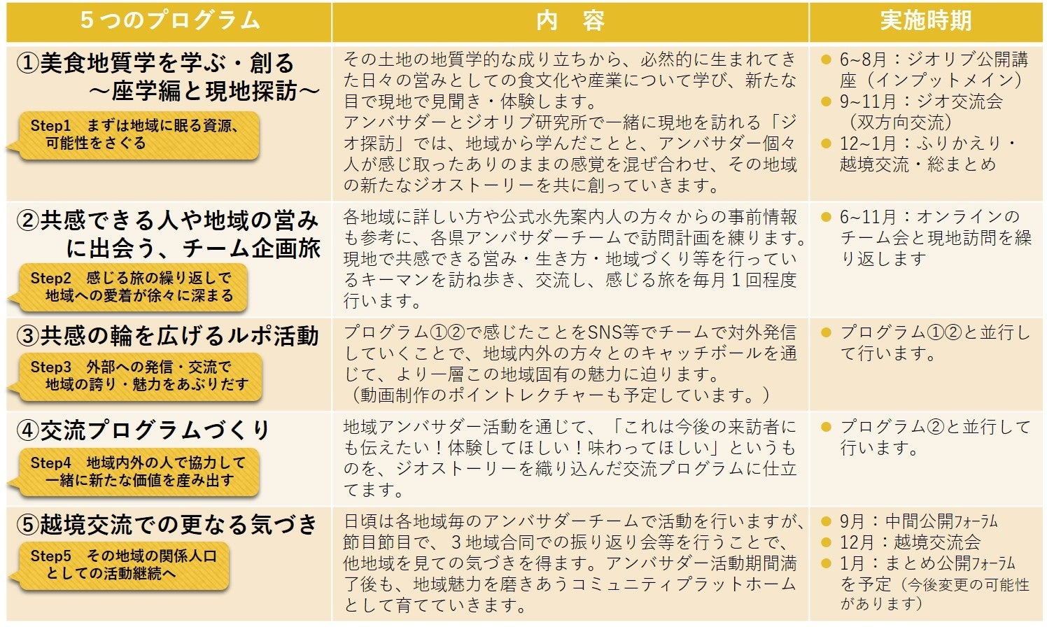 今回のプログラムでは、地域固有のジオストーリーを見つける「美食地質学」を媒介として、県外から来訪する「アンバサダー」と、県内で地域への愛着をもって日々活動されている「水先案内人」、地質学や観光の専門家で一緒にチームを組み、調べたり考えたり体験しながら1年を過ごすことで、その人にとってその地域がかけがえのない存在になる「第2のふるさとづくり」を試みます。