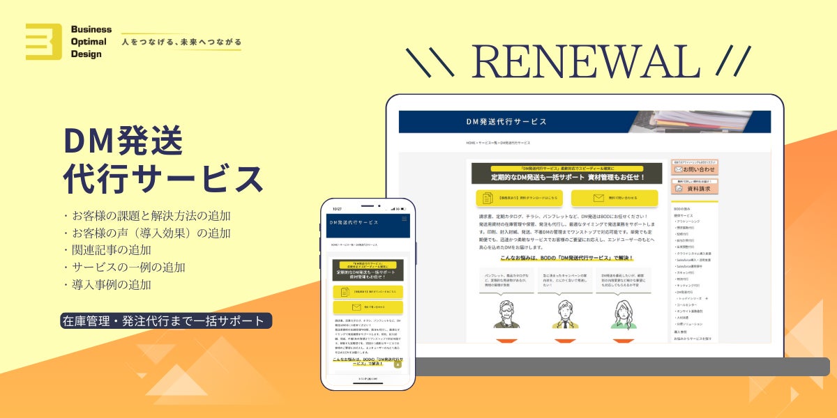 BODは、DM発送代行サービスを通じて、ターゲットとの効果的かつ持続可能なコミュニケーションを支援しています。サービスページをリニューアルし、コンテンツを充実させることで、今後も皆さまのビジネスのターゲットに応じた最適なコミュニケーションを提供するサービスを展開していきます。