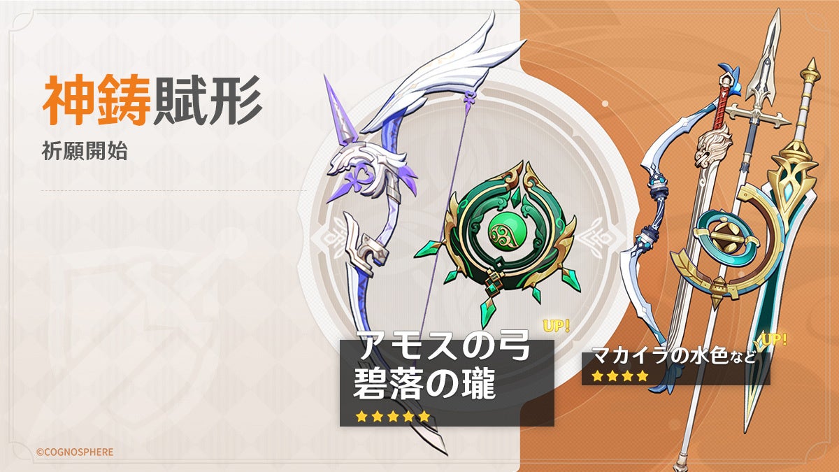 期間中、新★5武器「法器・碧落の瓏」、★5武器「弓・アモスの弓」などの出現率が大幅にUPします。