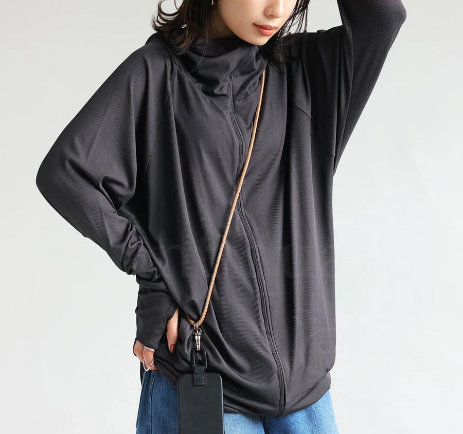 UVカット・接触冷感機能がついた、大人女子に心強いハイスペックなラッシュガードパーカーです。しっかり高さのあるハイネックとフードで首元も日焼けから守り、袖元の指穴に指を通せば手の甲まで隠れるため、ぬかりない紫外線対策が可能。ゆったりしたドルマンシルエットで多機能ながらお洒落なパーカーは、お家や職場での冷房対策、お買い物やお散歩の紫外線対策にも。シーンレスで活躍してくれる万能アイテムです。