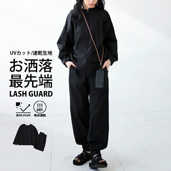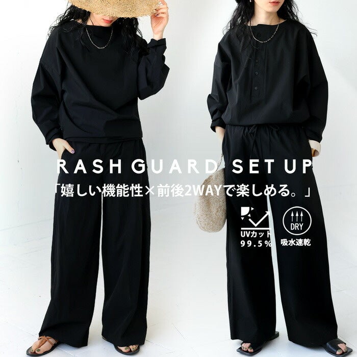 強い日差しからお肌を守ってくれるラッシュガード。セットアップでコーデが簡単に完成します。トップスは前後2WAY仕様で、トップス・パンツとも単品使いもできるからコーデの幅が広がります。普段使いはもちろん、キャンプやフェスなどのアウトドアでも活躍。シャカっとした素材はスポーティーな雰囲気とこなれたデザインが絶妙なバランス。これからの季節の大人女子に心強い、機能性もお洒落さも兼ね揃えたアイテムです。