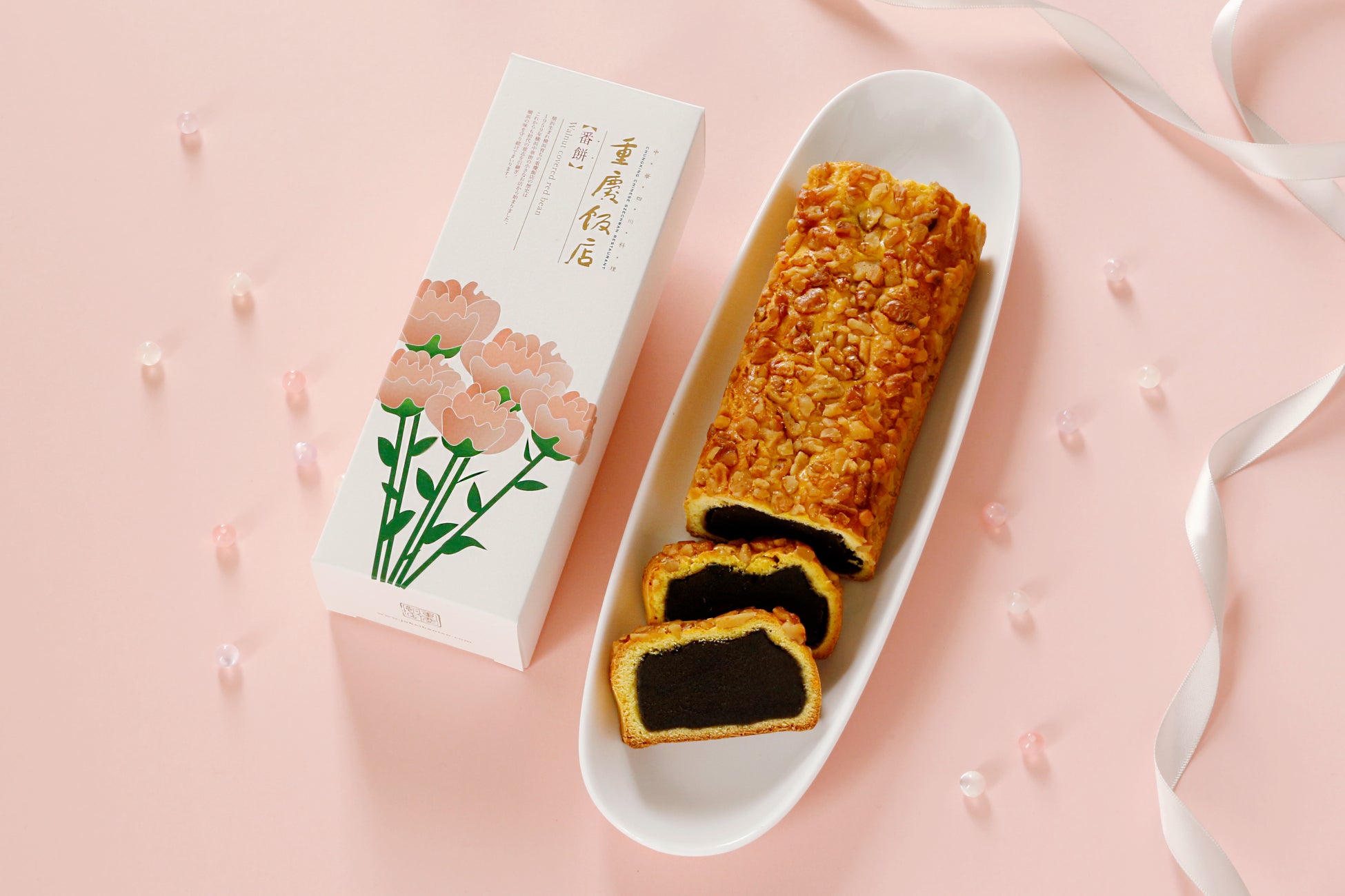 番餅は、豆沙餡(黒餡)をしっとりとした皮で包み、表面にはローストしたクルミをトッピングした重慶飯店一番人気のオリジナル中華菓子です。重慶飯店では毎年、母の日に合わせ、「温かい心」「感謝」の花言葉を持つピンクカーネーションの絵柄をモチーフにしたパッケージの番餅をご用意しております。今年は5本のカーネーションをあしらったデザインをご用意いたしました。お土産としてももちろん、日頃の感謝を込めて、大切な方へのギフトとしてもぜひご利用ください。詳細は下記となります。