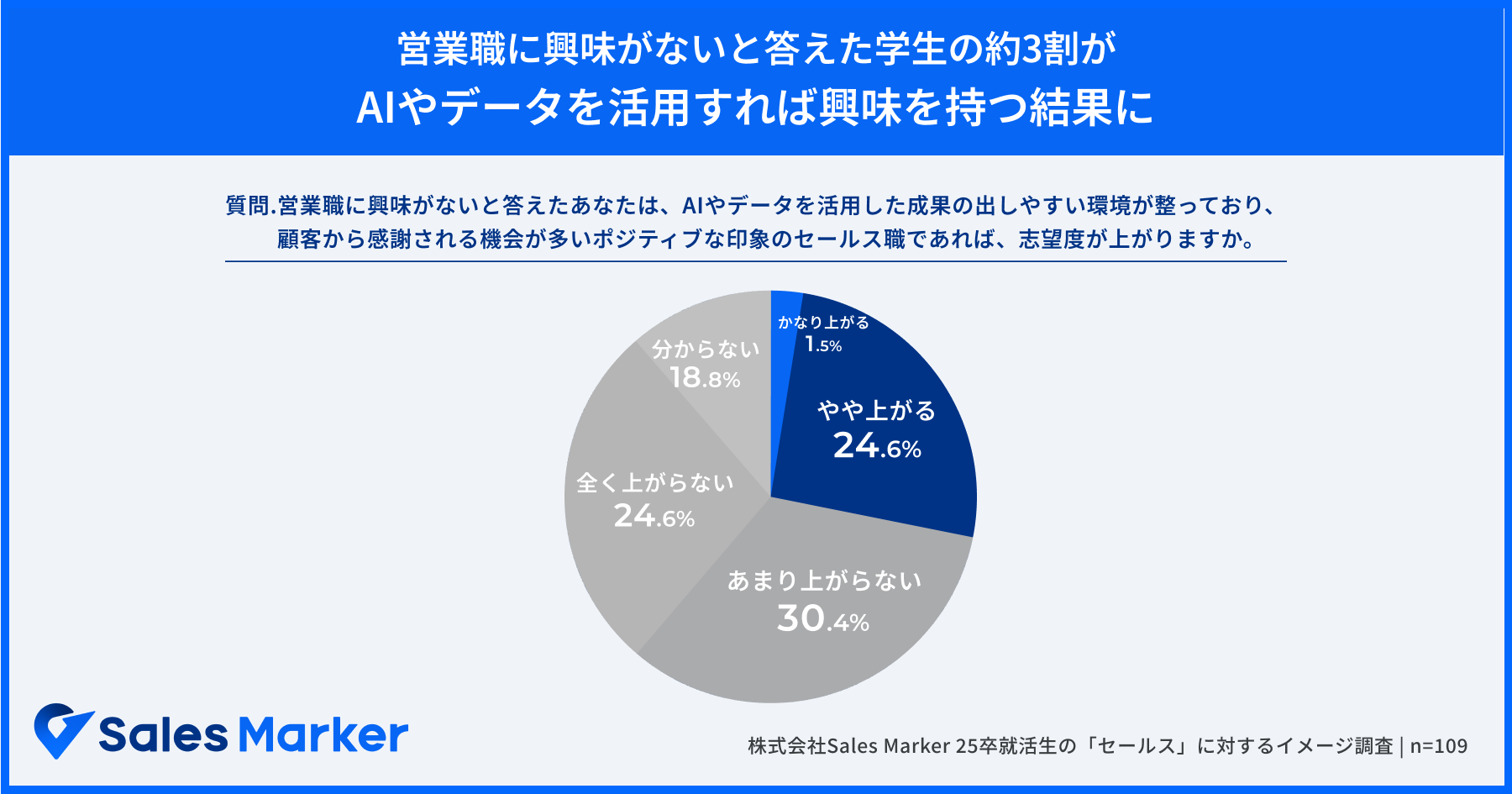 反対に、セールス職への興味が「あまりない」「全くない」と回答した方に、「あなたは、AIやデータを活用した成果の出しやすい環境が整っており、顧客から感謝される機会が多いポジティブな印象のセールス職であれば、志望度が上がりますか。」(n=69)と質問したところ、「かなり上がる」が1.5%、「やや上がる」が24.6%という回答結果となりました。