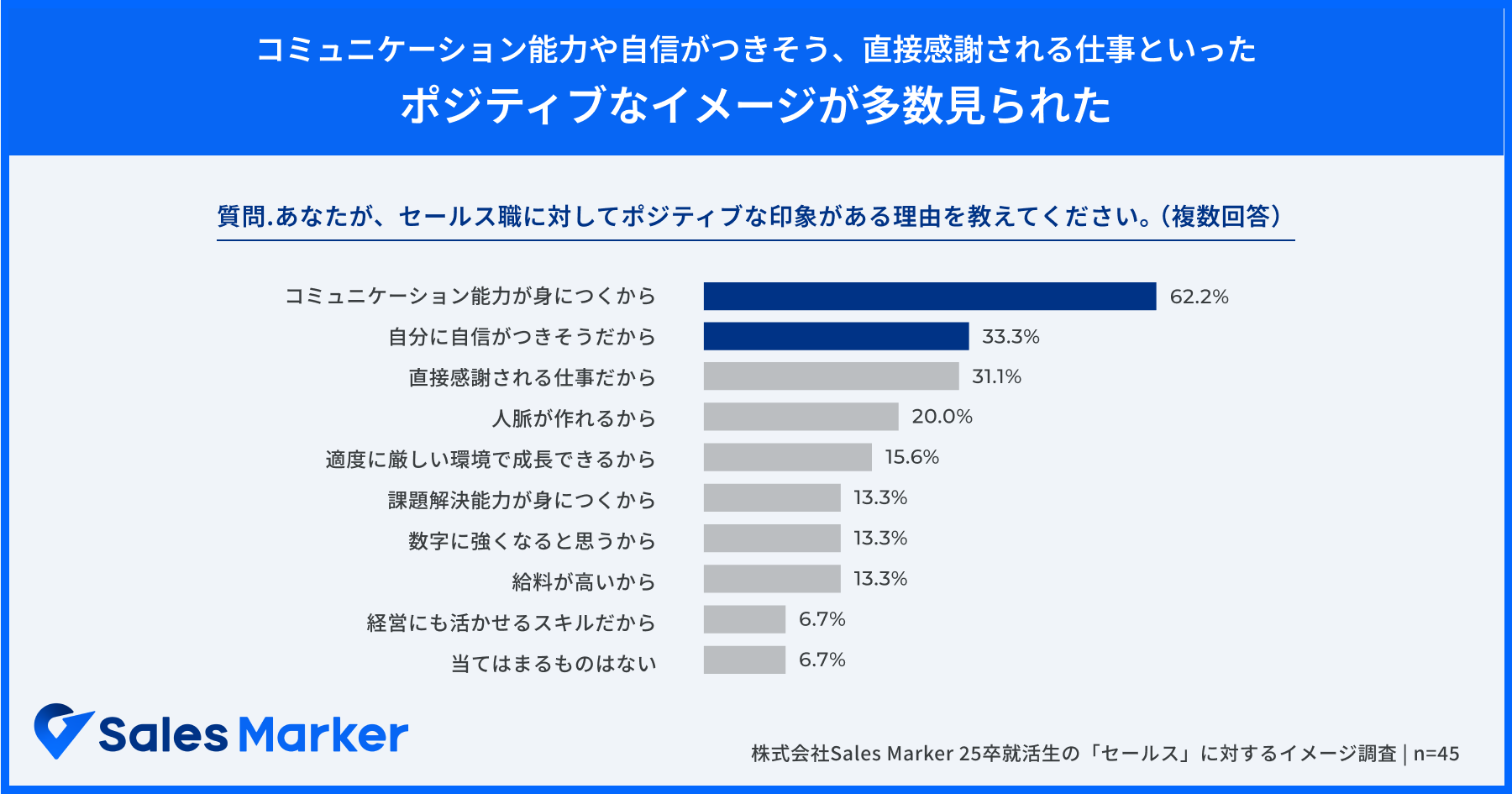 前項で「かなりポジティブ」「ややポジティブ」と回答した方に、「あなたが、セールス職に対してポジティブな印象がある理由を教えてください。(複数回答)」(n=45)と質問したところ、「コミュニケーション能力が身につくから」が62.2%、「自分に自信がつきそうだから」が33.3%、「直接感謝される仕事だから」が31.1%という回答結果となりました。