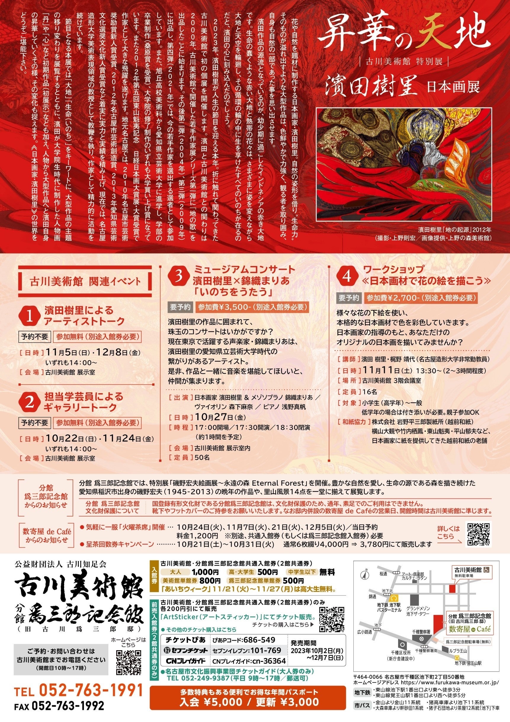 入館券:古川美術館・分館爲三郎記念館共通入館券(2館共通券) |大人1000円 / 高・大学生500円 / 中学生以下無料|美術館単館券800円 / 爲三郎記念館単館券500円 ※「あいちウィーク」11/21(火)〜11/27(月)は高大生無料