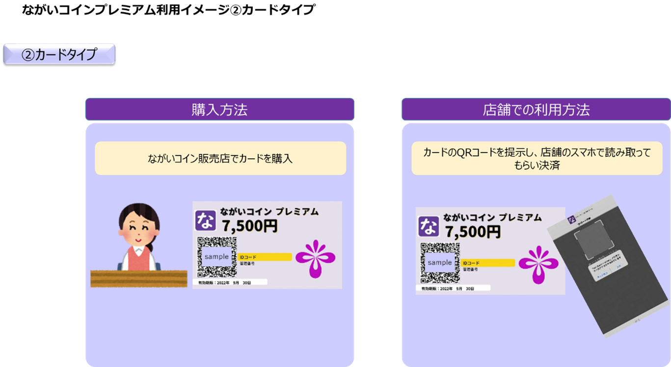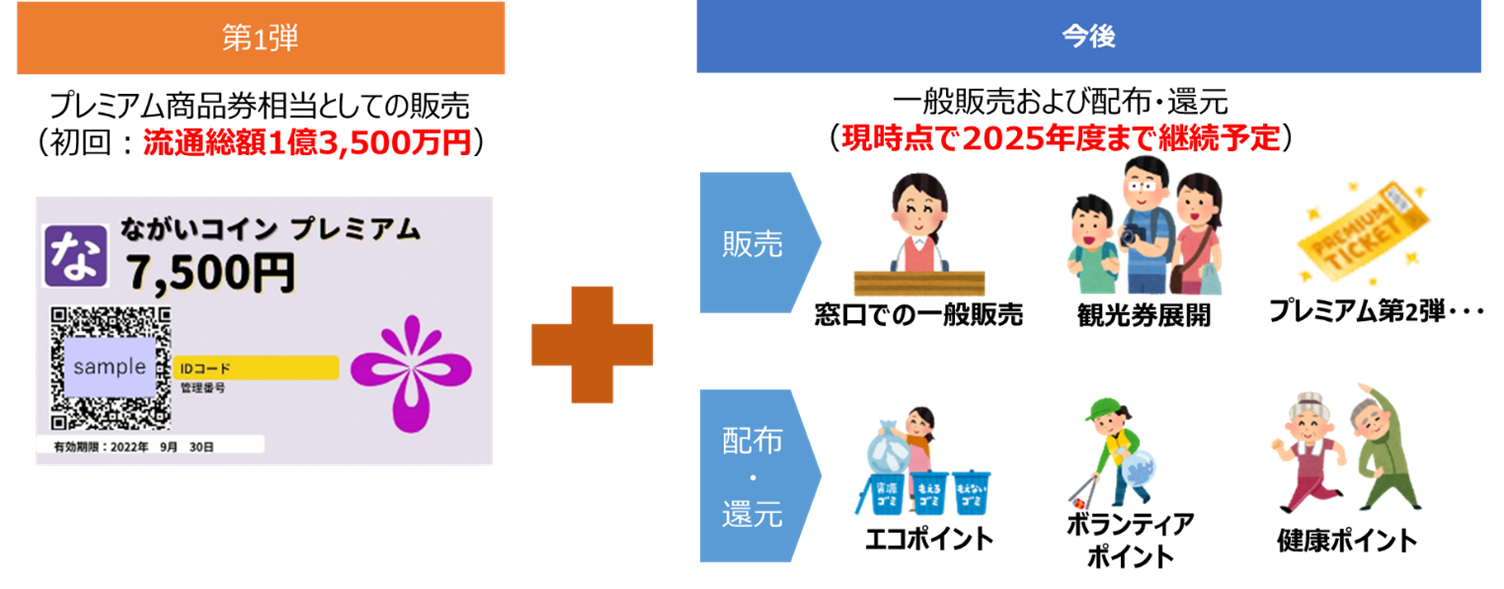この取り組みにおける事業の一つとして、NTT東日本グループであるNTTカードソリューション(東京都品川区、 代表取締役社長:奥本雅之)の電子地域通貨プラットフォームを活用し、2022年5月27日より電子地域通貨「ながいコイン」の本格展開を開始します。