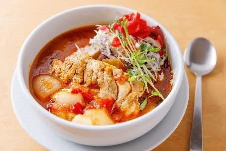 何処かのタイミングで芦北産生姜を感じるトマトベースの野菜入りスープカレー。スープにおぼれそうな鶏をほぐして、全混ぜリゾット風で召し上がれ。