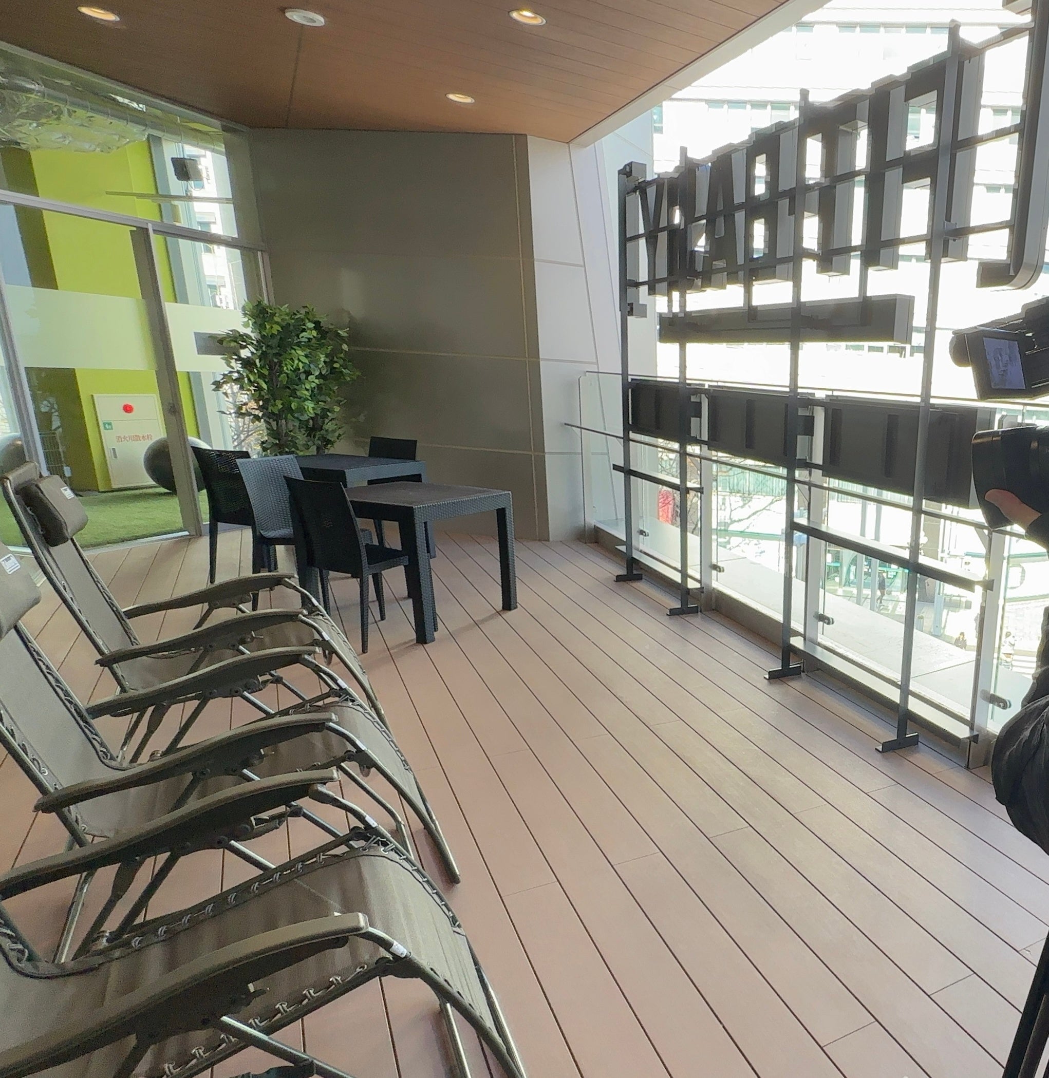 トレーニングやサウナの後にインフィニティチェアで一息できるテラス、共有型のオープンスペース、コワーキングスペースを完備。ご自分のパソコンを持ち込んで調べ物をしたり、コミュニケーションの場として活用したりすることができます。