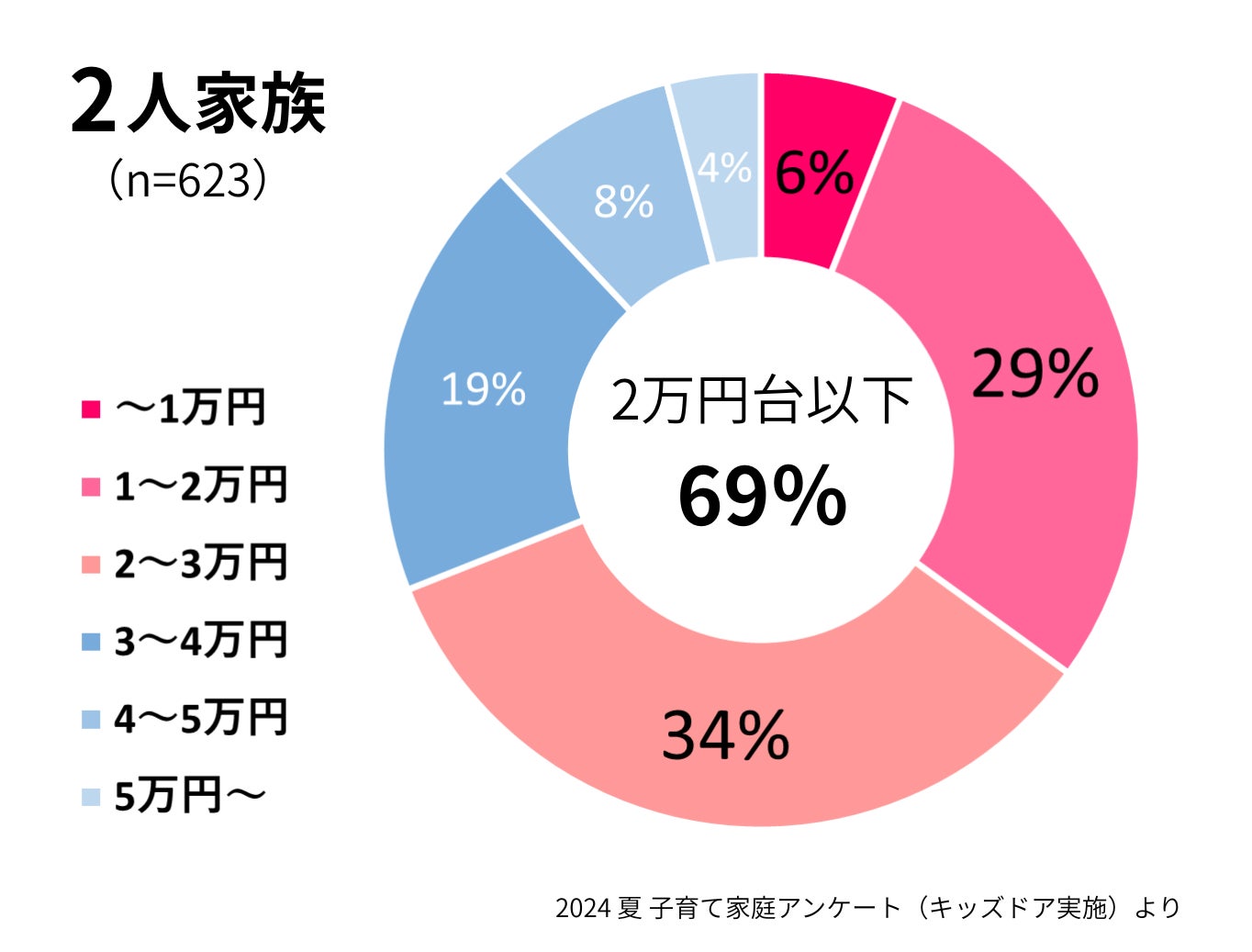 2人家族(親1人・子1人)の場合、約7割の家庭で1か月の食費にかけられる金額が2万円台以下でした。1人当たり1万円程度で生活しているということになります。