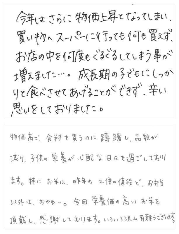 「物価高で色々ととても大変な状況の中、お米までもが高騰、とてもとても厳しい現実です。家族で納豆ご飯だけの日もあります。なんのために生きてるんだろう…と思う時もあります」
