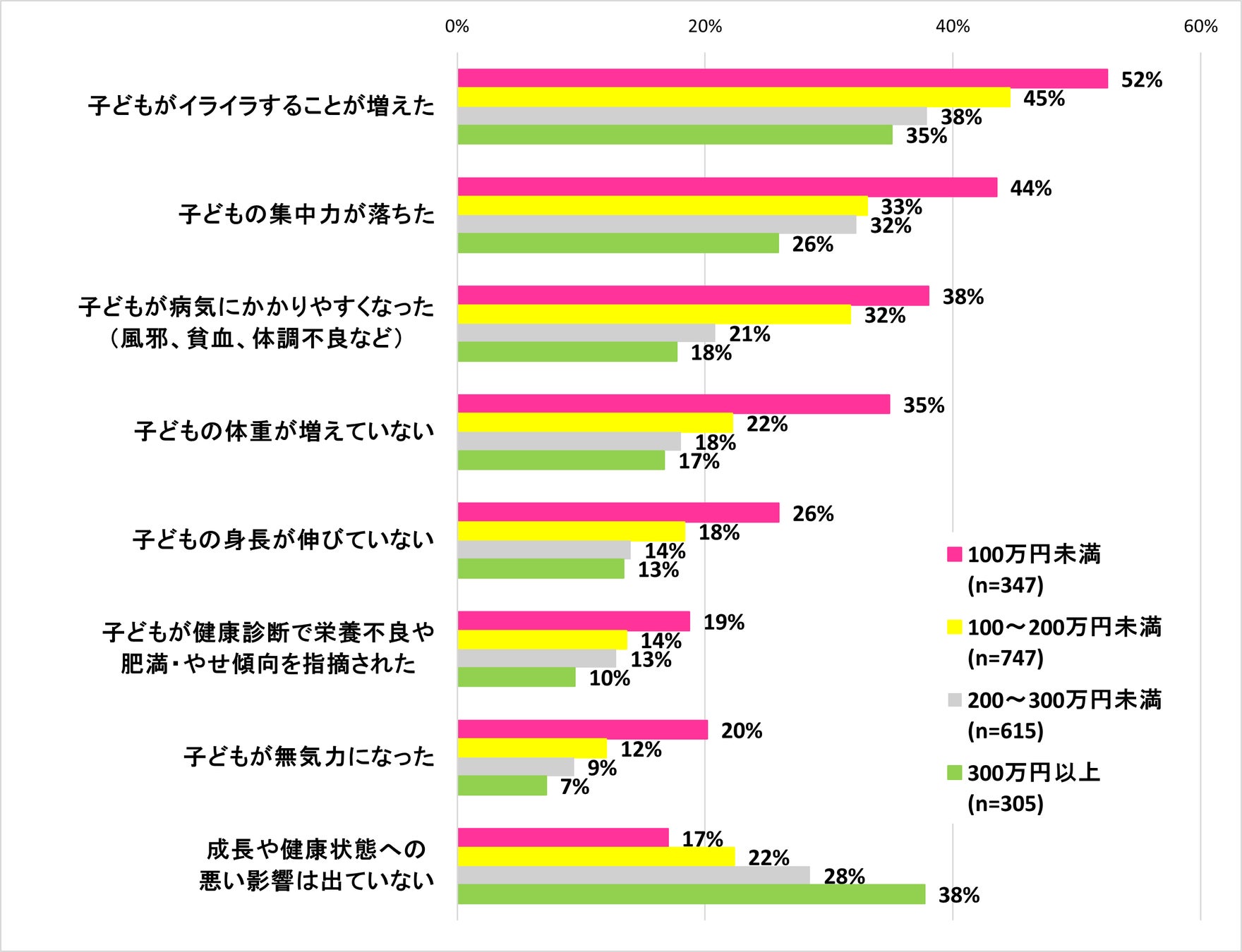「イライラすることが増えた」「集中力が落ちた」といった日常生活への悪影響は、所得の低い世帯の約半数で顕著に生じています。「病気にかかりやすくなった」「体重が増えていない」「身長が伸びていない」などの子どもの成長や健康状態への悪影響が、世帯所得が低いほど高い割合で表れています。