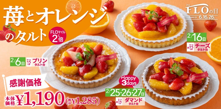旬を迎えたフレッシュな苺と、爽やかな甘さのオレンジをたっぷりと盛り付けた直径約14~15cmのホールタルトを、FLOの日限定価格・税込1,285円で販売いたします。