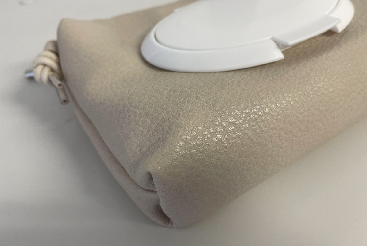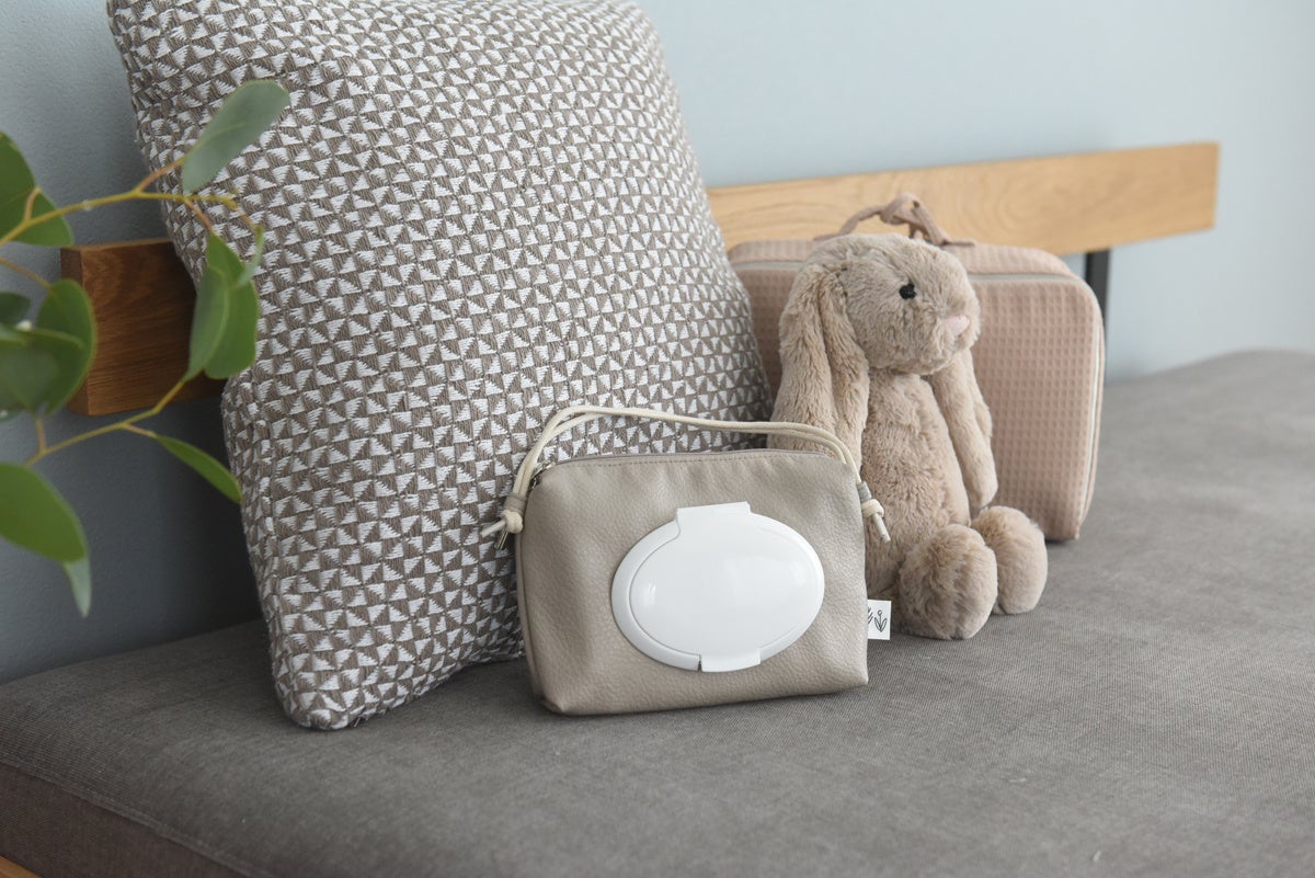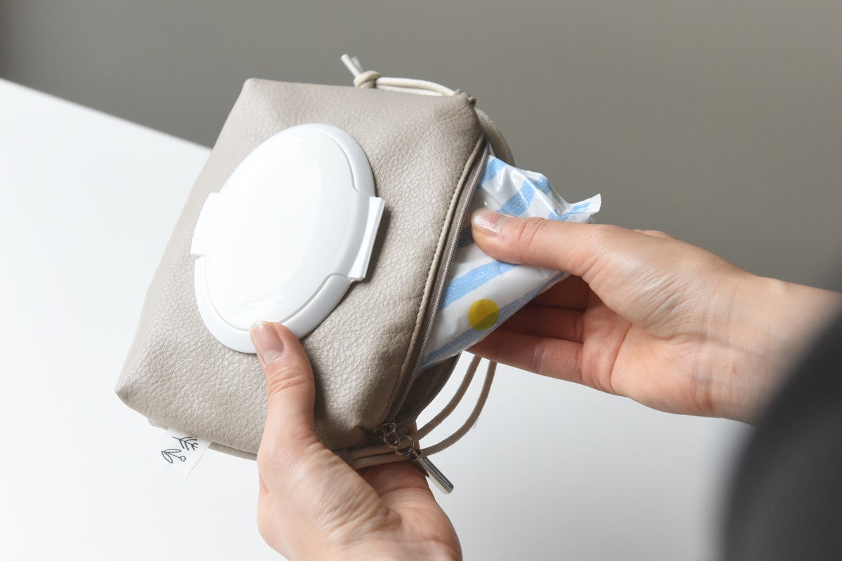 フェイクレザーを使った上品ルックスで、大人の女性好みにつくった「おしりふきポーチ」。アイボリー、ライトグレー、チャコールグレーの3色で、5/25(木)発売。