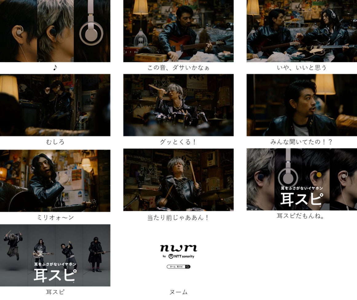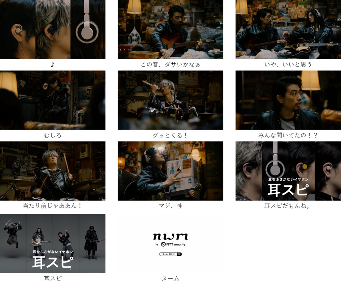 「マジ神 耳スピだもんね」篇は、「当たり前じゃああん!」とテンション高くドラムス(GO)が応え、その後、天を仰ぎながらギター(ONE)が「マジ、神!」と呟き、「耳スピだもんね。」のナレーションで幕を閉じます。