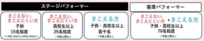 また、きこえない、きこえにくい人をはじめ、誰もが楽しめる開閉会式をつくるために、「きこえない、きこえにくい」、「きこえる」などの個々人の違いを互いに尊重し、それぞれの個性を活かして共に表現することで、共生社会の実現へとつなげていきます。