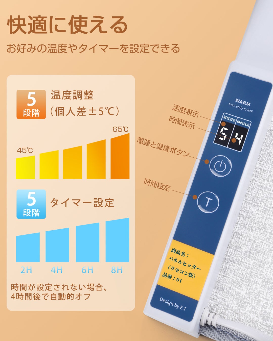 【タイマー機能付き】4段階(2時間/4時間/6時間/8時間)タイマーがあり,電源を消し忘れてしまった場合も安心。【5段階温度設定】5段階(45~70℃)を手軽にボタンで操作できます。程よい暖かさで冬でも快適。