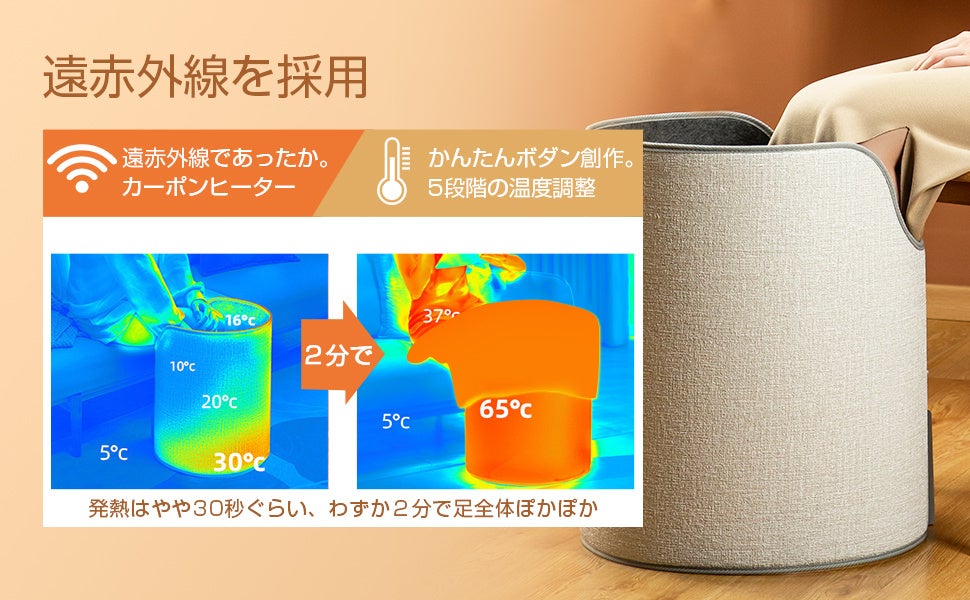 【30秒で発熱!遠赤外線効果でポカポカ】急速発熱実現のために、炭素結晶加熱材料を採用して、数十秒だけで暖かい、まるで足湯のように足元から全身を温めます。