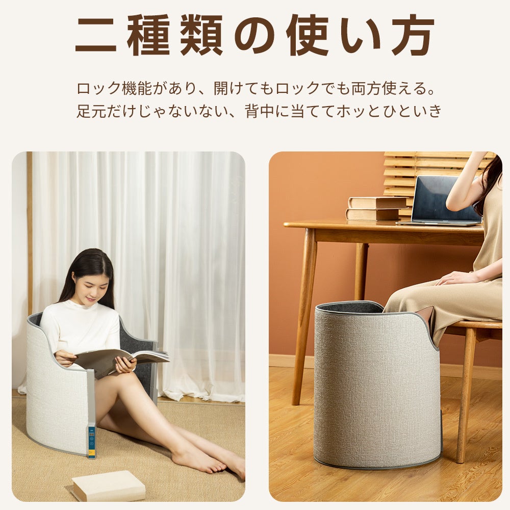 【2way使い方ー開けてもロックしても使える】ロック機能があり、開けてもロックでも両方使える。足元だけではなく、背中なども使える。
