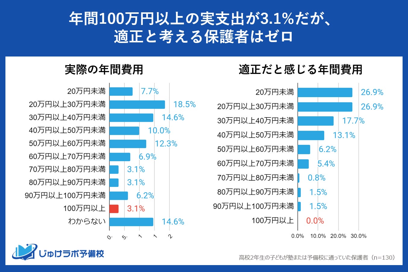 じゅけラボ予備校(所在地:大阪市北区、代表取締役:後藤智則)は、現在、塾または予備校を利用している高校2年生の保護者130名を対象に、塾や予備校の費用に関する教育費調査を実施しました。