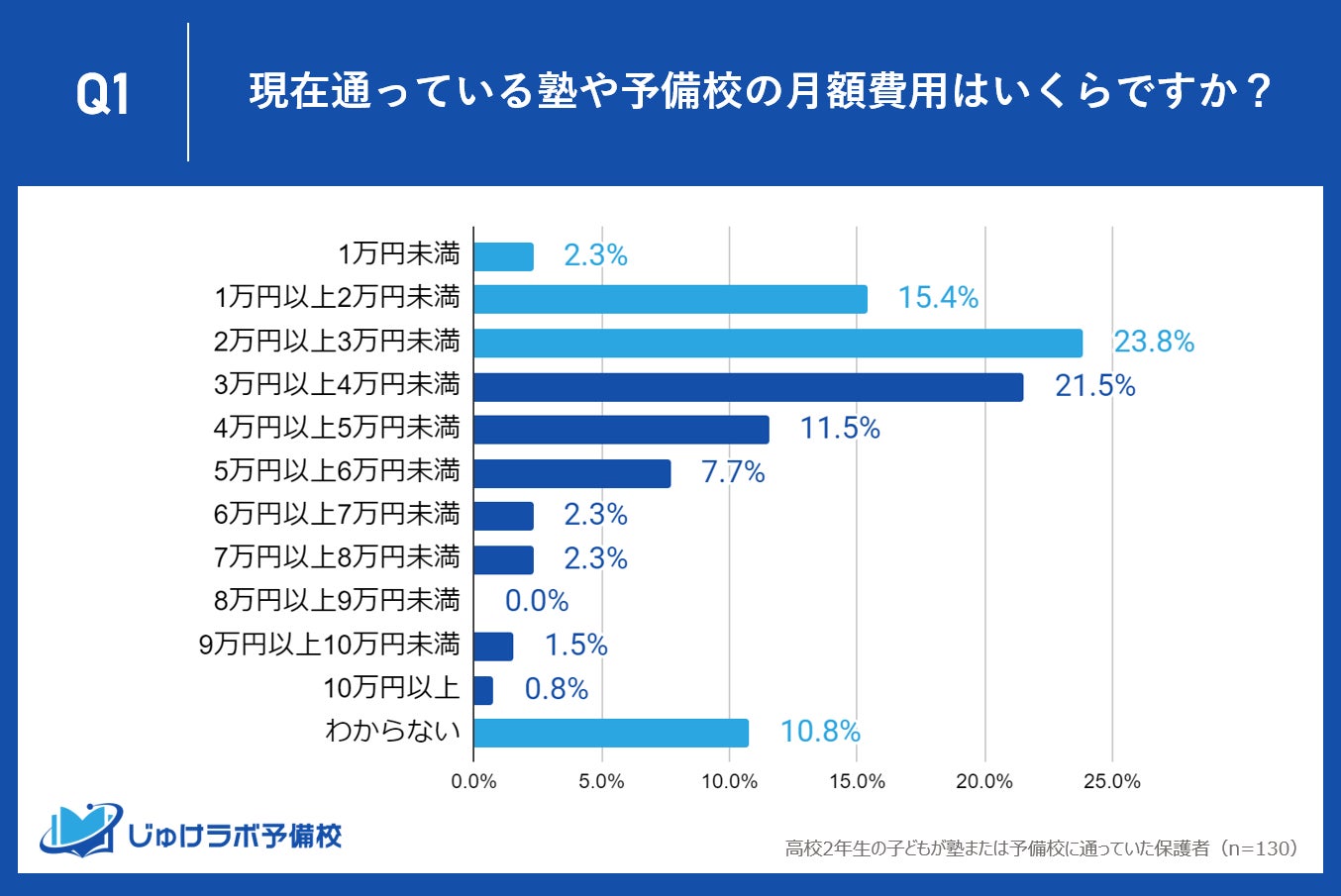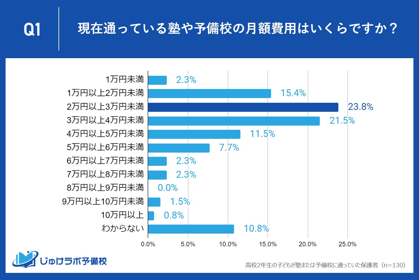 月額「2万円以上3万円未満」が23.8%で最多、次いで「3万円以上4万円未満」が21.5% - 高2の45.3%が月額2〜4万円を塾・予備校費用に支出