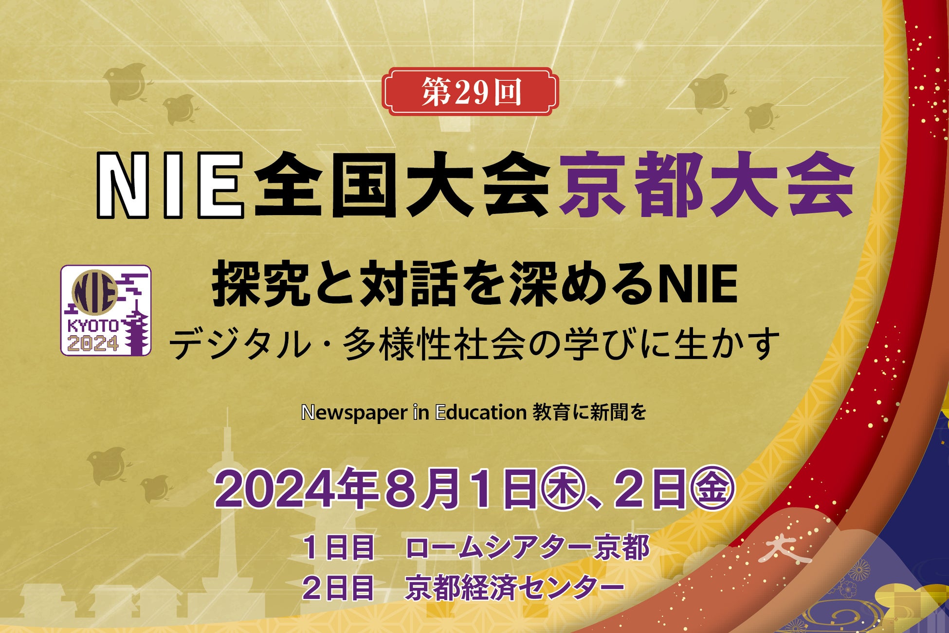2024年8月1日(木)、2日(金)に「第29回NIE全国大会京都大会」(主催:日本新聞協会、主管:京都新聞社)を京都市内で開催します。当初、申し込み受付期間を6月30日(日)までとしておりましたが、市民の方々からの関心が高く、お問い合わせもいただいておりますことから、7月15日(月)まで延長致します。教育・新聞関係者、市民の方々のご参加をお待ちしています。
