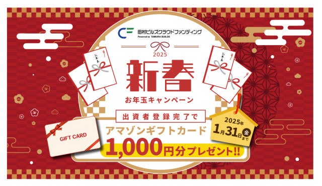 不動産取引実績で山口県トップクラスを誇る株式会社田村ビルズ(本社: 山口県山口市黒川 代表:田村 伊幸)が提供する田村ビルズクラウドファンディングは、日頃の感謝を込めて、2025新春お年玉キャンペーンを実施いたします。2025年1月31日(金)までに出資者登録完了をしていただいた方全員が対象です。アマゾンギフトカード1,000円分をプレゼントさせていただきます。