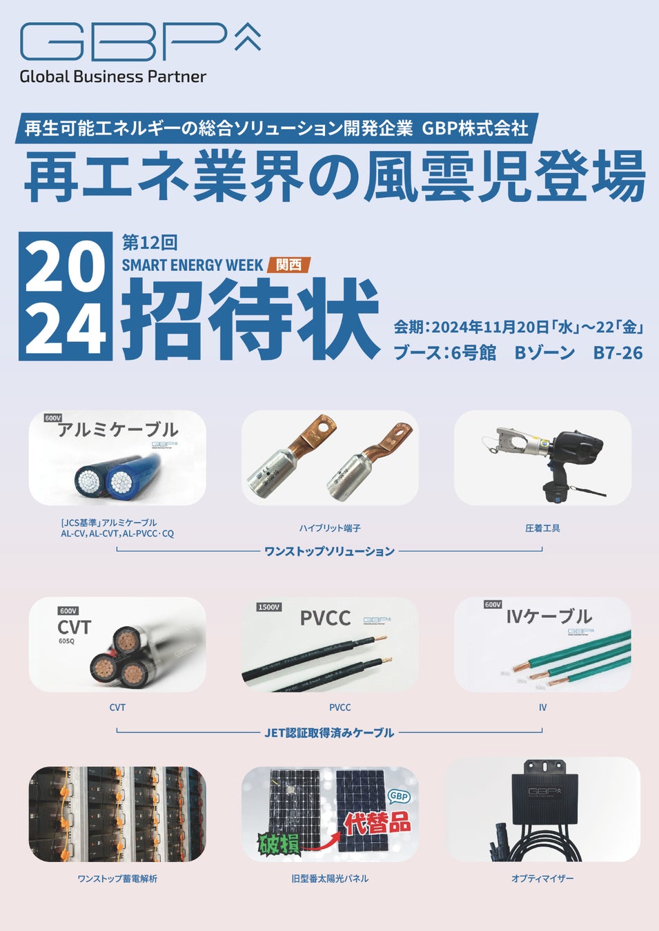 再生可能エネルギー、EV自動車部品、AI及びIoT領域における先進技術を駆使し、グローバルで急速に成長している,~再エネ業界の風雲児~ GBP株式会社(本社:東京、以下GBP)は、2024年11月20日(水)より3日間、インテックス大阪にて開催される『SMART ENERGY WEEK 関西』に出展します。アルミケーブル、ハイブリット端子、圧着工具を含む、ワンストップアルミケーブルソリューション、蓄電解析ソリューション、JET認証取得済みのCVTケーブルなどを展示します。