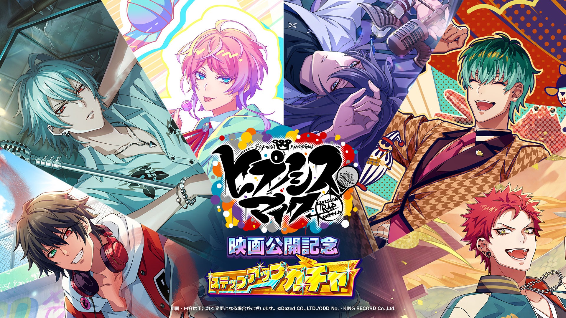 期間中『ヒプドリ』に7日間ログインでキャラ育成アイテムや挑戦回復メダル等に加え、合計で1,500ジュエル、さらに10連プレミアムガチャチケットがもらえる映画公開記念ログインボーナスを開催いたします。