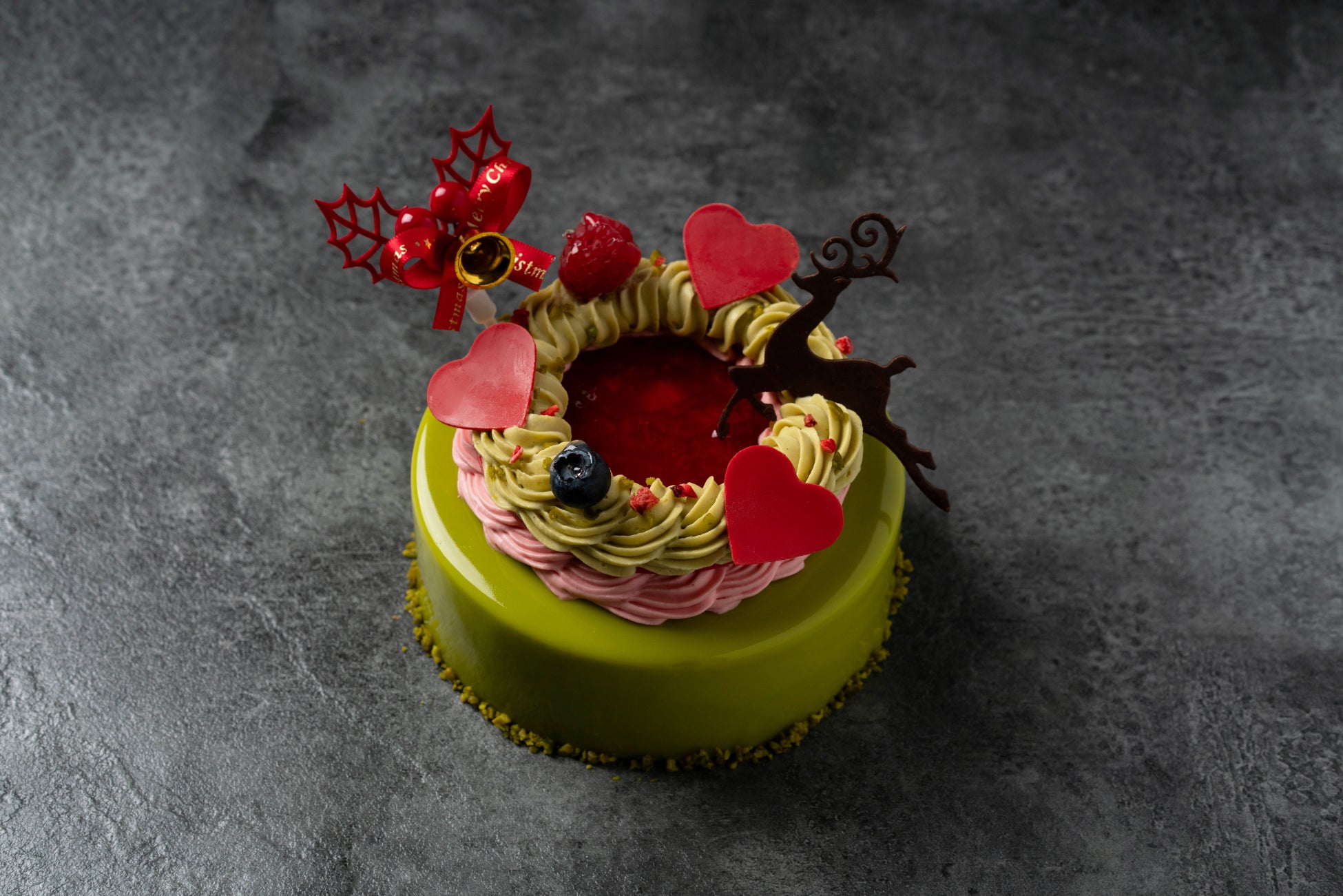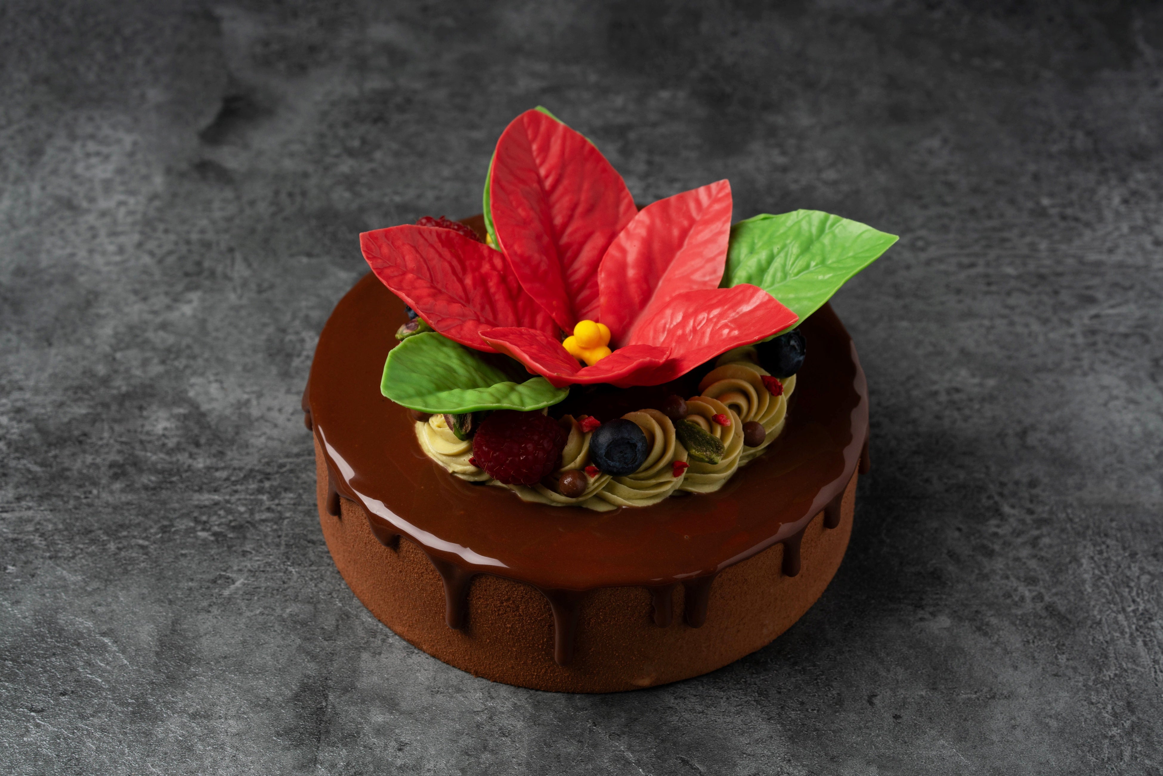 真紅のポインセチアの迫力満点、ショコラとピスタチオの絶妙なバランスがどちらの