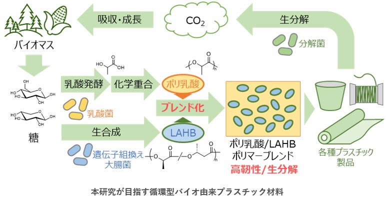 国立研究開発法人 産業技術総合研究所(以下「産総研」という)マルチマテリアル研究部門 今井 祐介 研究グループ長、冨永 雄一 主任研究員、触媒化学融合研究センター 吉田 勝 研究センター長、田中 真司 主任研究員、国立大学法人 神戸大学(以下「神戸大学」という)科学技術イノベーション研究科 田口 精一 特命教授、高 相昊 特命助教は、株式会社カネカと共同で、ポリ乳酸が抱えるもろさと生分解性の課題を、微生物により生合成される乳酸と3-ヒドロキシブタン酸の共重合体(略称:LAHB)をブレンドすることで克服しました。
