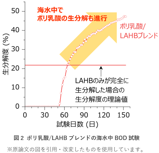 ポリ乳酸は、工業用コンポスト中のような高温多湿条件下では、加水分解で低分子量化したのちに微生物による生分解を受けます。しかし、常温の土壌環境中や海洋環境などの温度の低い環境下では、生分解はほとんど進みません。一方、LAHBは、海洋中や土壌中を含め、さまざまな環境で完全に生分解されることが確認されています。そこで、前述したポリ乳酸/LAHBブレンドの海洋生分解特性を、BOD試験により評価しました。試験には兵庫県高砂港の海水を用いました。数十日間の誘導期ののち、いったん生分解が始まると、急激に分解が進みます(図2)。LAHBが、いわゆる「分解スイッチ」の役割を果たしています。生分解反応は、もともと海洋中で生分解することがわかっているLAHBのみが分解した場合の生分解度の理論値を大幅に上回って進んでいます。これは、LAHBとのブレンド化によって、ポリ乳酸の生分解も促進されていることを示しています。