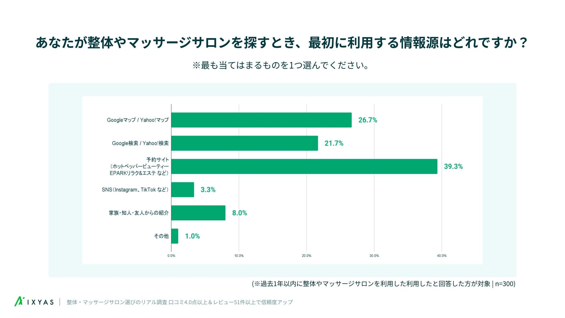 「過去1年以内に整体・マッサージを利用した」と回答した726人のうち300人を対象に追加調査を行った。最も多く利用された情報源は「予約サイト」(39.3%)となり、「Googleマップ/Yahoo!マップ」(26.7%)、「Google検索/Yahoo!検索」(21.7%)と続いた。