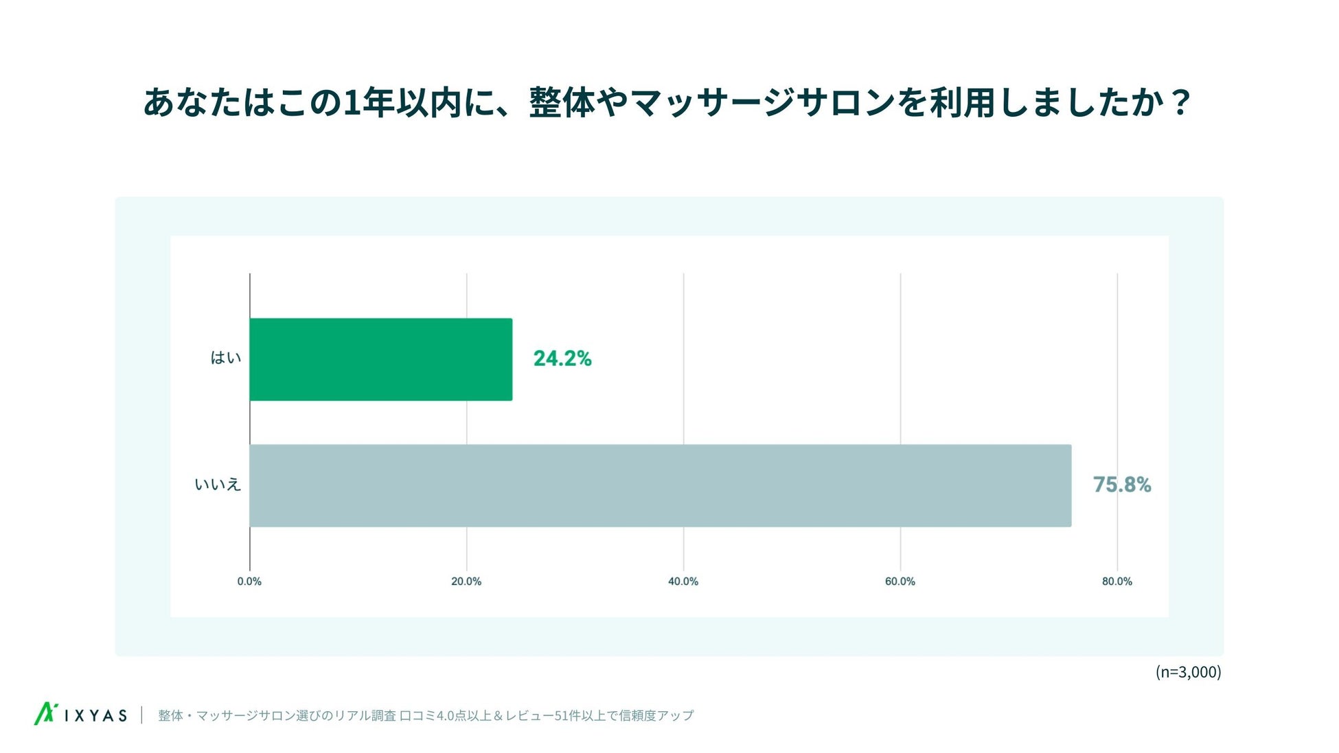 21歳から59歳の男女3,000人を対象に「この1年以内に整体・マッサージサロンを利用しましたか?」と尋ねたところ、「はい」(24.2%)「いいえ」(75.8%)となった。
