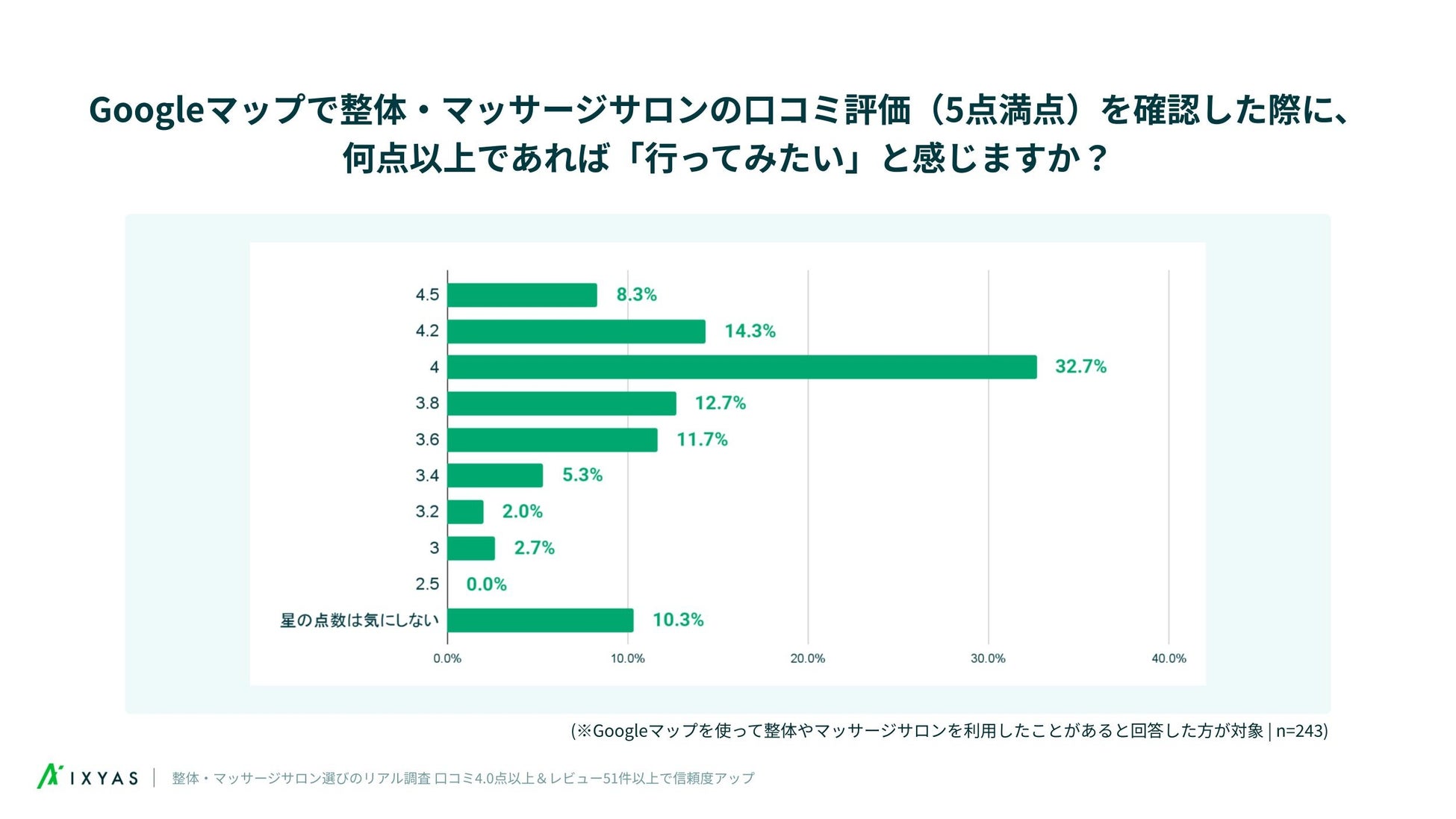 ・整体・マッサージサロン選びの際、45.4% が Googleマップの口コミ評価「3.8点以上」 を重視している。